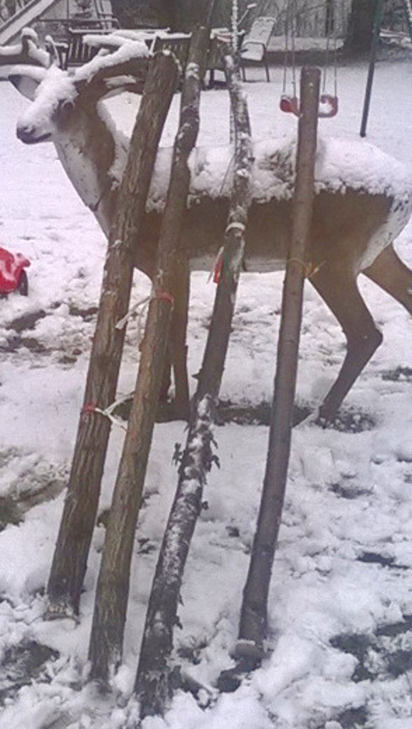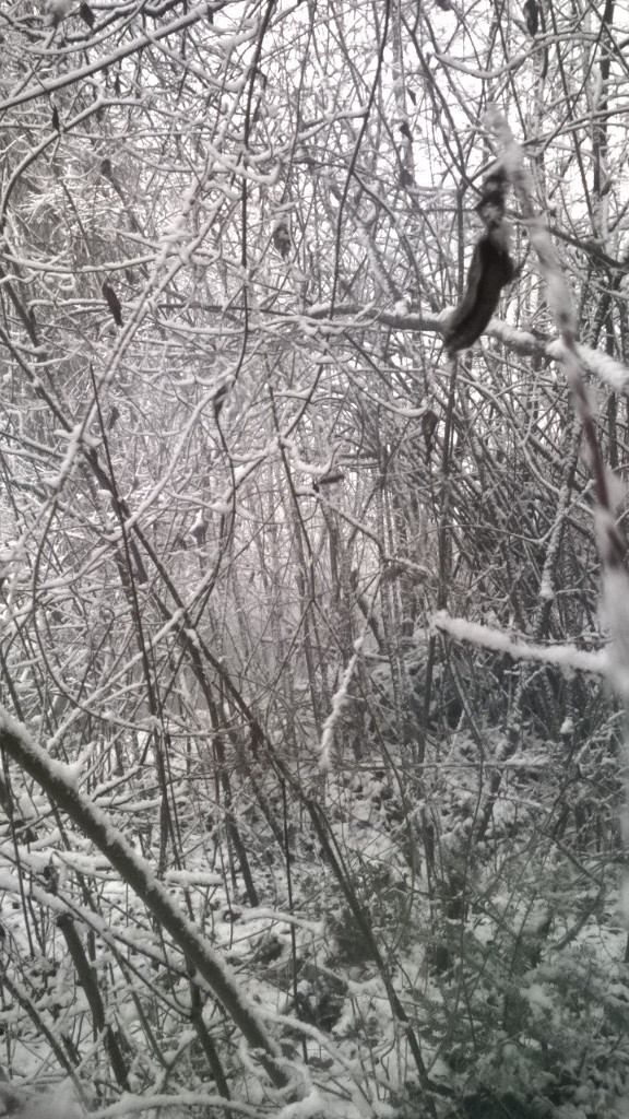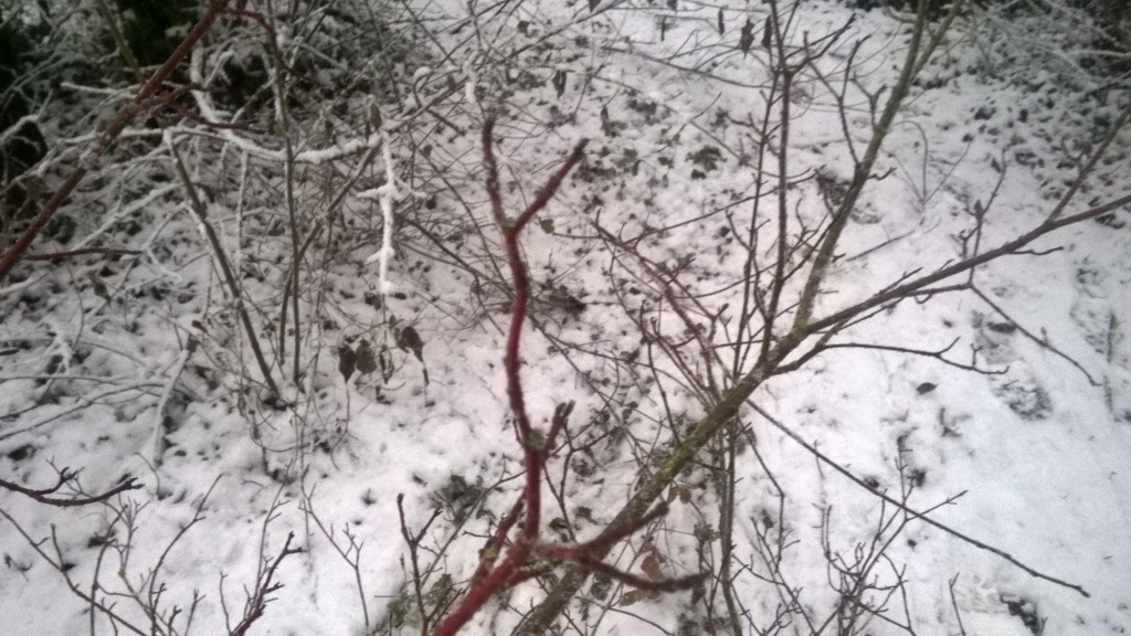 In diesem Schneegestöber steht der Hartriegel: Mann sägt an ihm rum: Jetzt ist er weg Detail: Robinie 1: