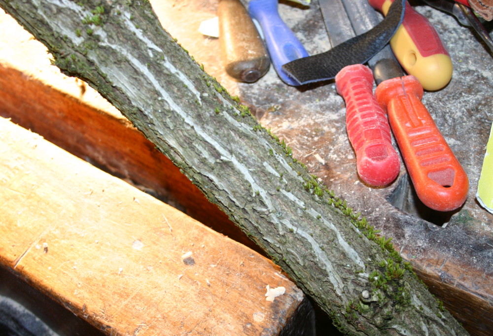 Vor zwei Jahren habe ich bei einem Apfelbaum einen dicken Ast entfernt und die Stücke einfach in eine Ecke gelegt. Ich habe das Runde dann mit dem E-Hobel eckig gemacht und ein schönes Stück für den Griff zugesägt.