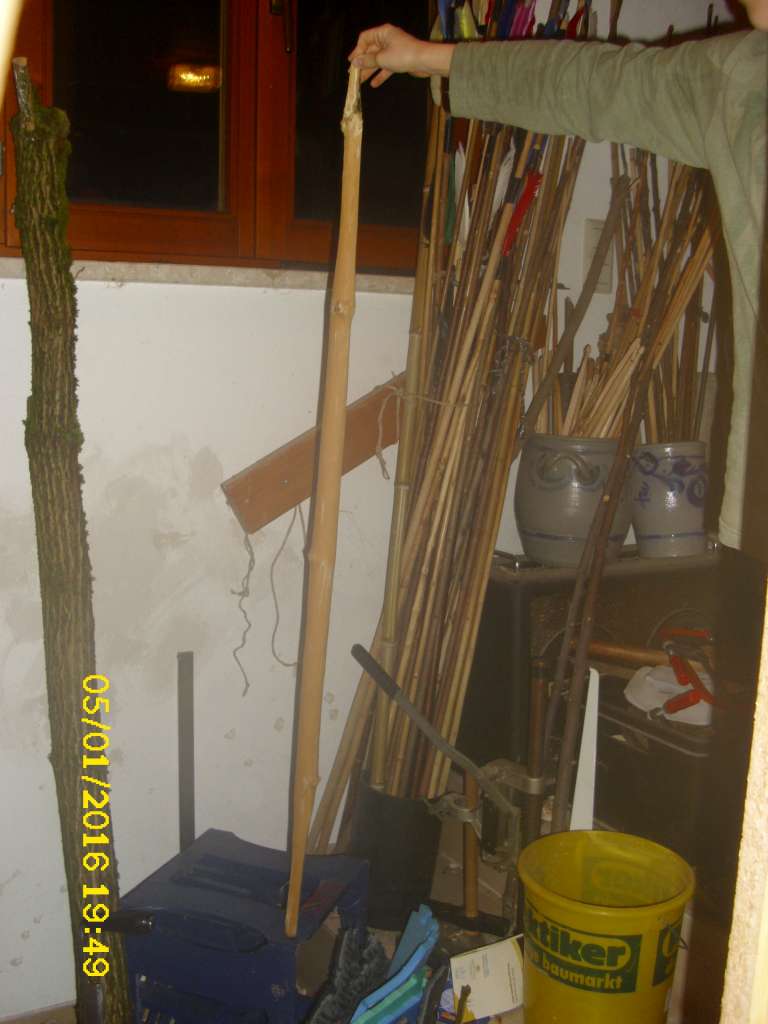Teststave u. Hollerhaupstamm am Trockenplatz (Wohnzimmer): Holler der Länge nach: Hasel u. Holler mit Meterstab (volle Länge, 2m): Ast im zukünftigen Hasel-Griff: Derzeitiger Trocknungsstaus:
