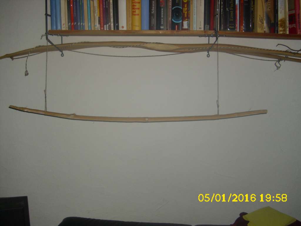 - erstes Mal auf dem Tillerbaum, noch rabiate 70#, viel zu viel für das Holz und mich - heutiges Photo, >55# (weiter geht meine Federwaage nicht, die vorherigen Werte waren hochgerechnet) bei 28", für einen 2m-Bogen für mich ein bißchen zu viel, geplanter auszug sind 33-34" bei ca. 55#,da muß noch ein bißchen getan werden, vor allem der Griff, Sehne muß ich auch noch bauen, finishen, naja wird knapp. - im Griff wurde er gedämpft,da er sich hier nach dem groben Zuschnitt etwas seitlich verzog (nur der Griff), verantwortlich war mit Sicherheit der prominente Ast in der Mitte Mal sehen, ob ich den noch in die Präsi krieg.