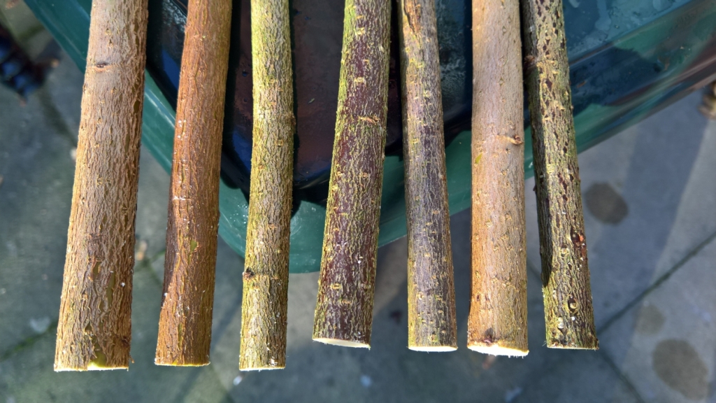 Wenn du aus Schoesslingen Pfeile bauen willst schau mal ob du im Garten eine Blasenspiere findest. Blaetter aehnlich Johannisbeere, Rinde rotbraun mit laengs aufplatzender hellbrauner, eher fusseliger Schicht obendrauf. Ist halt nicht einheimisch. Aber wenn sie schon rumsteht....