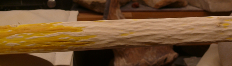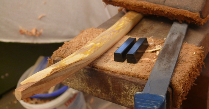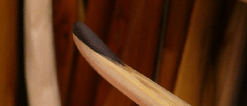 die beiden Faulbaumrohlinge sind halbwegs gerade geblieben. Habe sie noch ein bsschen runtergearbeitet und schonmal etwas gebogen... der Bruchtest-Streifen war nicht sehr vielversprechend - ist schon bei wenig Biegung über den Rücken geplatzt.