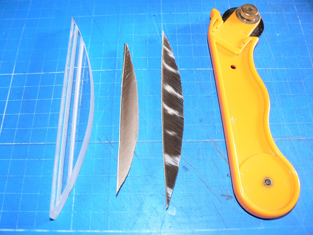 Die Kunststoffform ist eine Schablone um Federn in immer die selbe Form zuzuschneiden. Die Federn kommen damit nicht auf den Schaft.