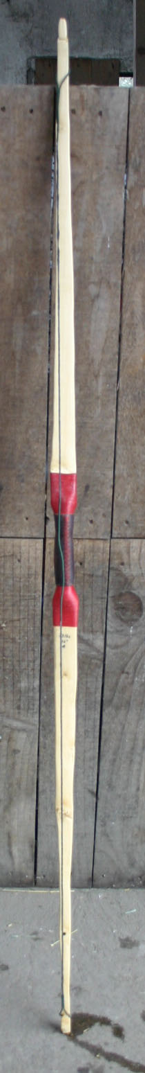 66´´ von Nocke zu Nocke, 23lbs bei 26´´ Auszug. Rückenansicht entspannt Bauchansicht Griff mit gewachstem Leder bezogen, die Wicklung aus Baumwollfaden mit Ponal blau versiegelt. Mit aufgespannter Sehne Bei vollem Auszug von ca.26´´.