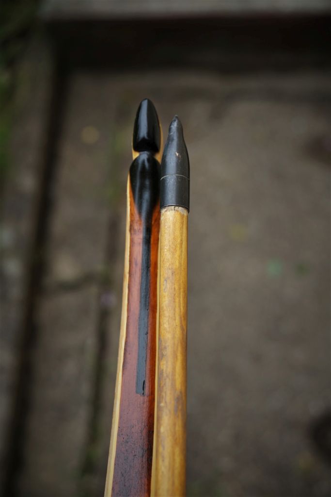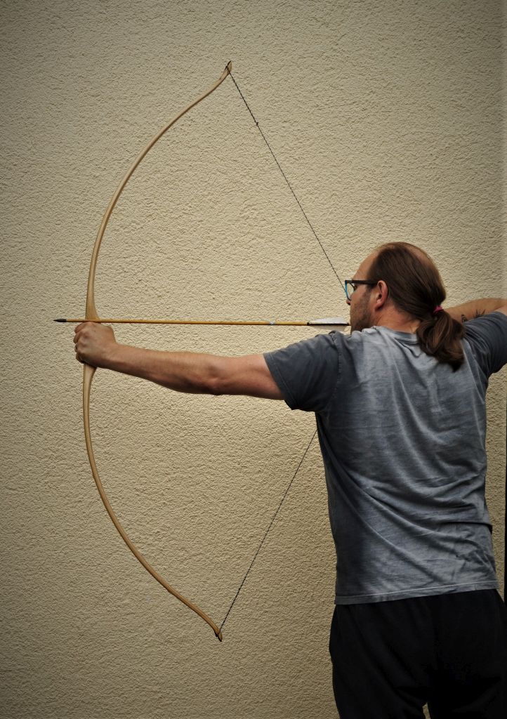 Ich hatte Glück, dass der Rücken des Hickory Bogens ziemlich gerade war und ich somit nichts entfernen musste, um das Bambus aufzuleimen. Zuerst habe ich durch das Tempern das Set entfernt und zwar so lange , bis die Wurfarme leicht Reflex waren. Danach habe ich Wurfarmenden leicht geflippt. Jetzt konnte ich das getaperte Bambus periflex mit dem Bogen verleimen. Das Bambus ist schmaler als der Bauch(Trapezförmig)… das ist wichtig um Set vorzubeugen.Beim ersten Zupfen am Bogen war schnell klar, dass der Bogen viel zu stark ist. Also musste ich den Bogen komplett neu tillern und das habe ich alles auf Standhöhe gemacht...ich habe den Bogen erst weiter ausgezogen, als er sich wirklich gut gebogen hat! Das alles hat sich wirklich gelohnt und der Bogen hat auch an Geschwindigkeit zugelegt. Bei Pfeile mit 9,2 gpp hat der Bogen 176fps , was wirklich nicht schlecht ist. Aber nun genug der Worte....