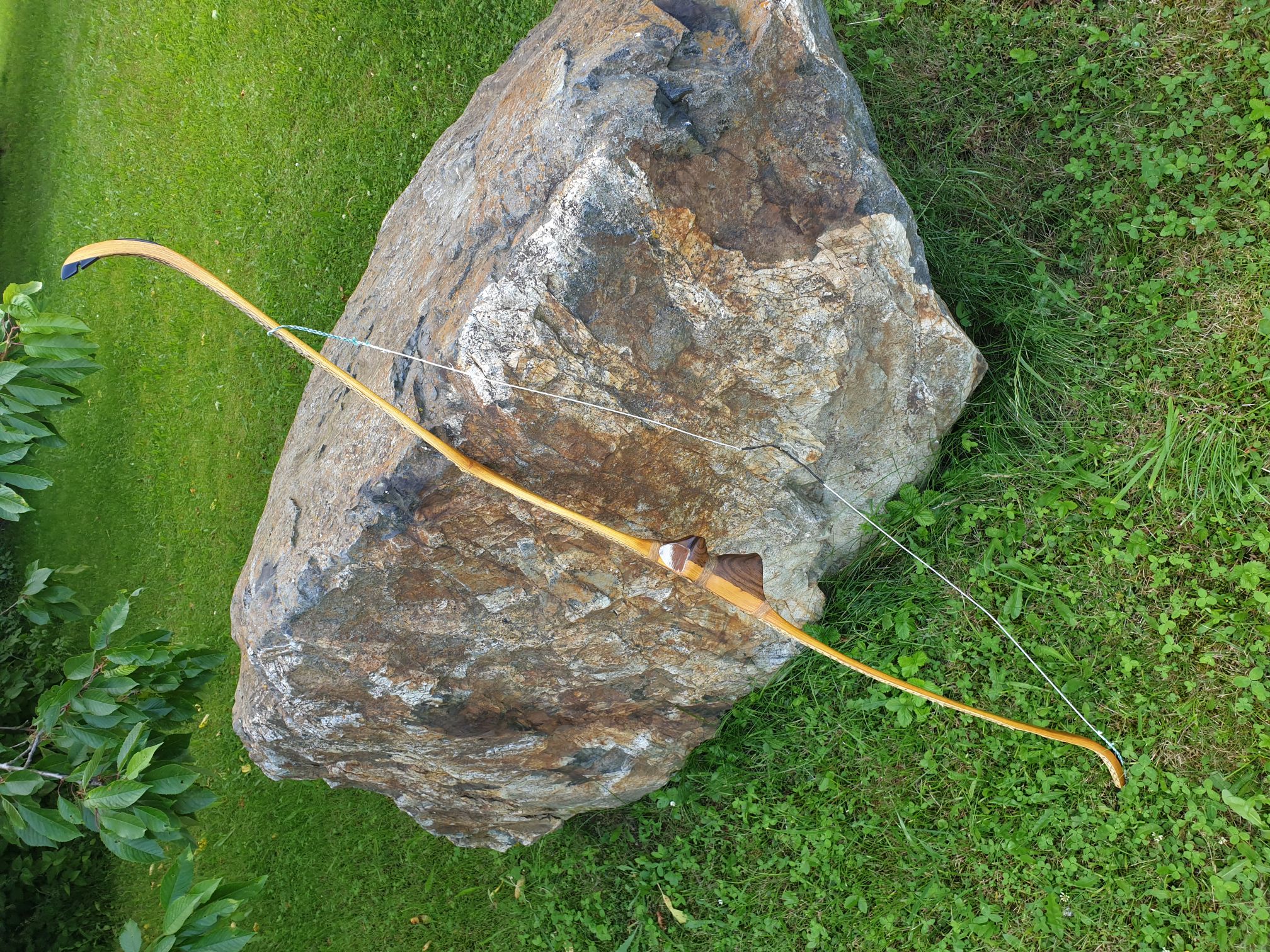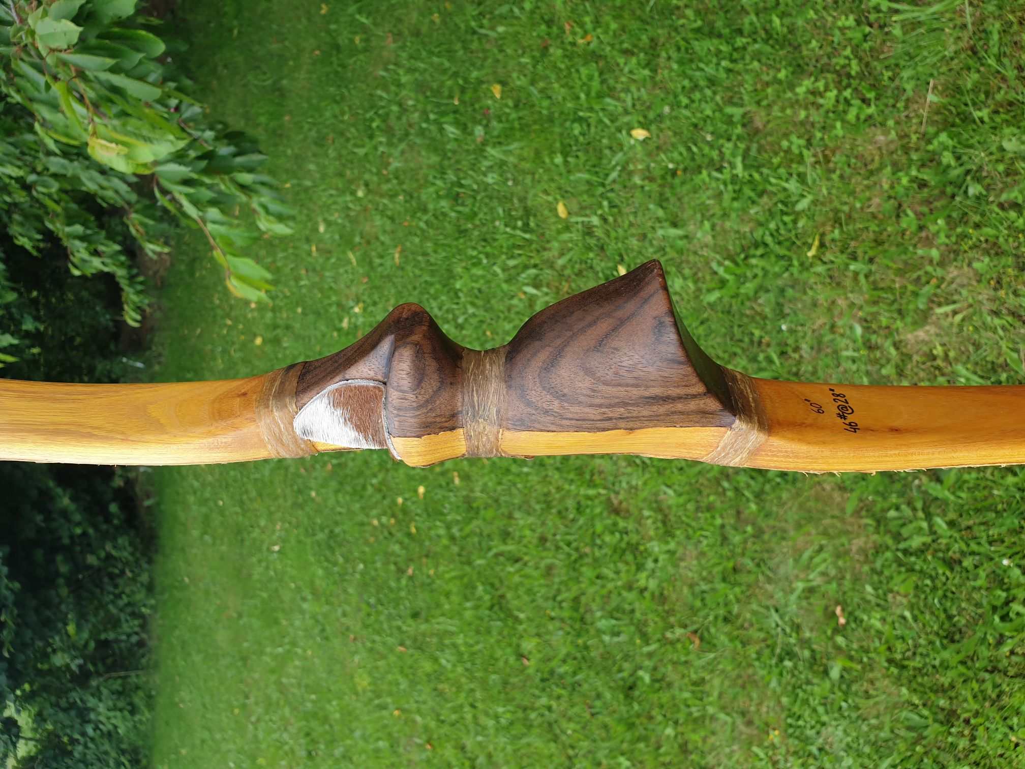 Erwünscht waren 45# und nach dem Einschießen und feinschliff kam ich hier auf 46#@28". Der Bogen ist 60" lang und zum Glück nicht kürzer, denn sein Auszug hat sich inzwischen erhöht auf über 29" 😅. Ich weiß es gibt auch einige Bereiche an den Wurfarmenden wo man ruhig noch Gewicht einsparen könnte, aber er will nicht dass ich was änder. Und das Backing ist nur für die Optik.