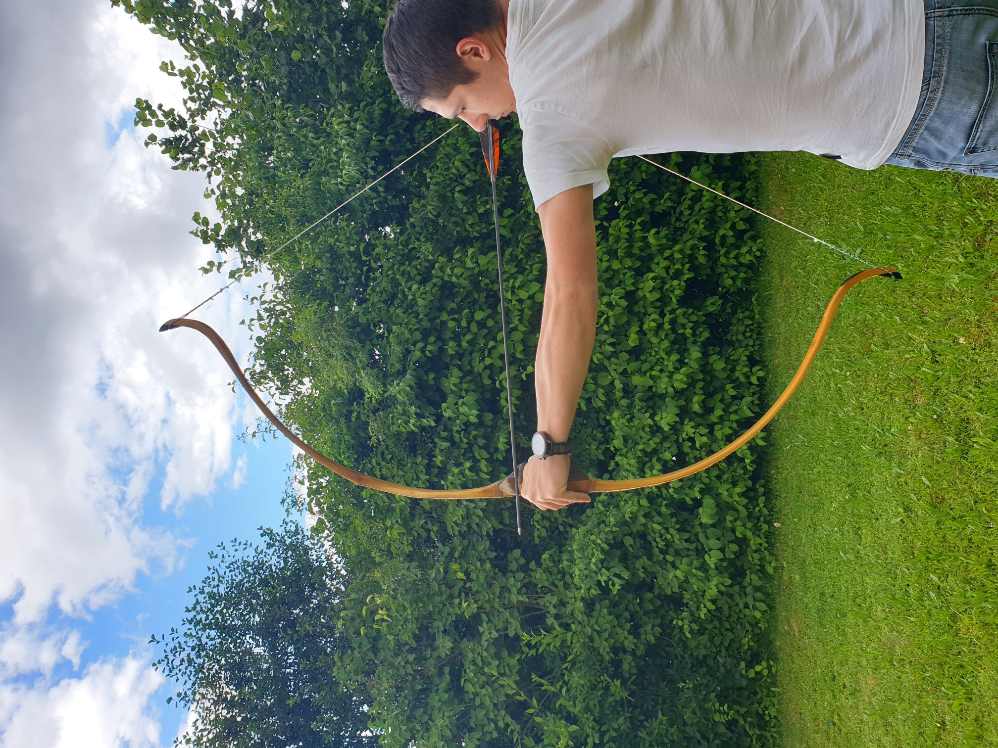 Die Standhöhe kommt mir auf dem Bild zu hoch vor. Auch der längere Anschubweg bei einer niedrigeren Standhöhe bringt bei Selfbows etwas mehr Leistung / Pfeilgeschwindigkeit.