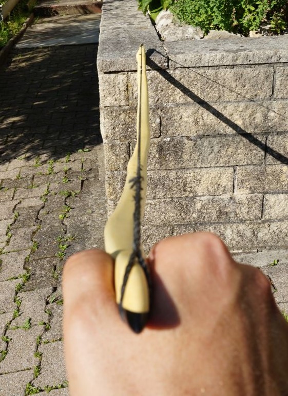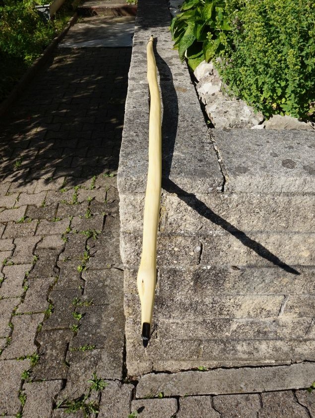 viele kennen das Pfaffenhütchen bereits vom SDBT 2020, denn da ist es beim Q&D in wenigen Stunden entstanden. Die 12 Staves wurden verlost und das hier habe ich bekommen. Es hatte von Anfang an schon ca 1'' deflex und im oberen Wurfarm in der Mitte einen stärkeren Relfex. Im oberen Wurfarm hat er im letzten Drittel zwei Äst , der vor dem Tip hat etwas Gammel drin. Deshalb ist im oberen Wurfarm im letzten drittel nicht viel Biegung. Den unteren habe ich an den oberen angepasst, so dass es gleichmäßig aussieht. Vielmehr wäre auch nicht gegangen, sonst hätte es sich negativ auf den Sehnenwinkel ausgewirkt.