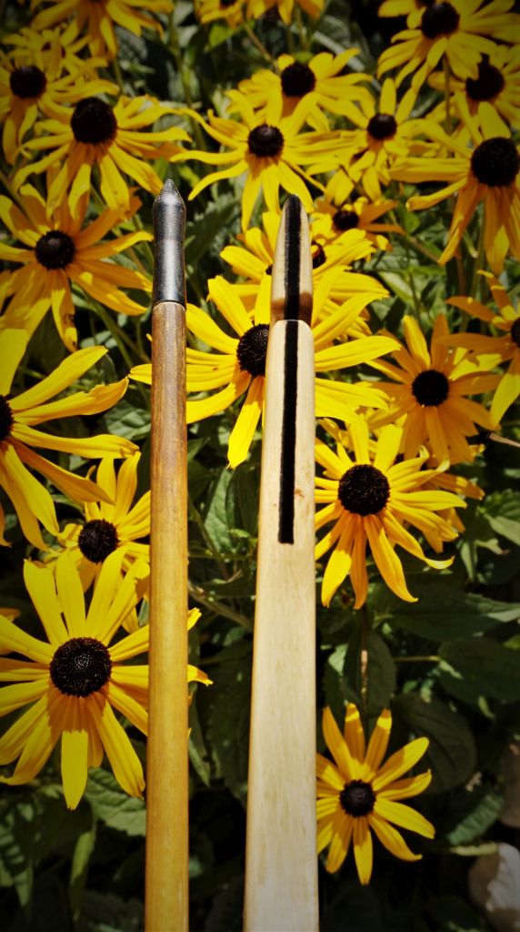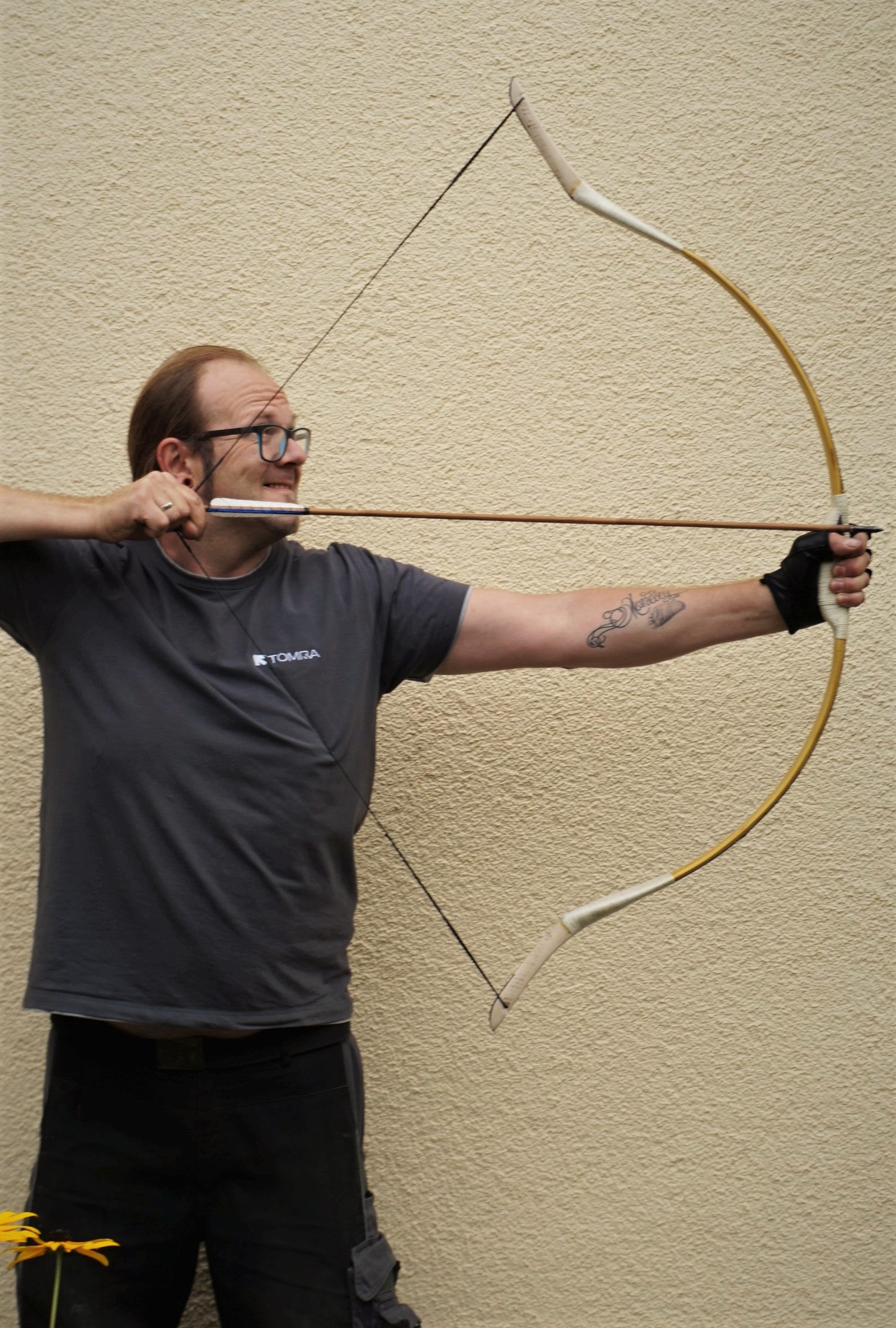 ich hatte einige Reststücke Bambus rumliegen von 40-50cm Länge und dachte mir daraus bau ich einen Übungsbogen für die Daumentechnik.(Schießen mit 6 Pfeilen in der Zughand, auf der Stelle galoppierend schießen, auf einem Bein schießen etc.) Gesagt getan...nach 2h hatte ich einen schießfähigen Bogen daraus gebaut. Leider hatte der Bogen gerade mal 20#@30'' und das war mir dann doch zu wenig. Hat zwar auch Spass gemacht, jedoch fehlt mir die Last auf dem Daumen. Da ich noch Reste von Osage darum liegen hatte, habe ich die unter das Bambus geklebt. Natürlich musste ich das Bambus in der Dicke reduzieren. Nach insgesamt 10h Arbeit habe ich einen guten Trainingsbogen heraus bekommen, der richtig Spass macht zu schießen und genügend Power hat. ;D Der kleine hat die 9gpp Pfeile mit 175fps im Durschnitt durch den Chroni gejagt.