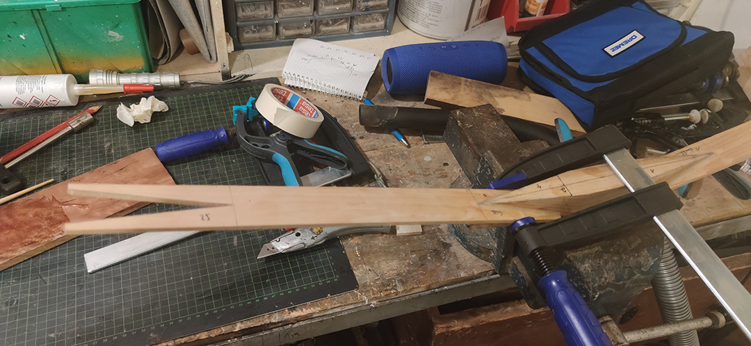 Habe die 5 Holzteile mit V-Spleißen zusammengeklebt mit dem guten Epoxydkleber von Rudi Weik ...