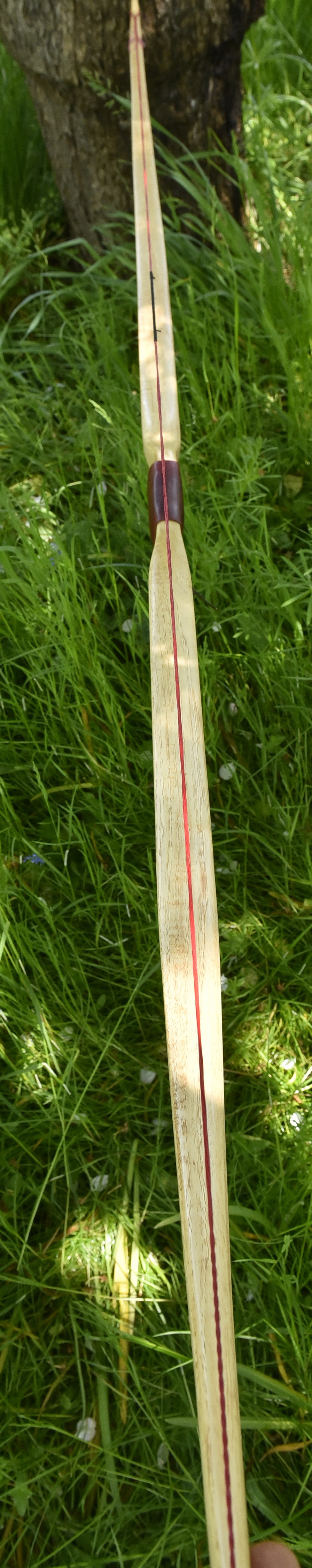 Er hat nun genausoviel Gewicht wie vorher aber fast 20# mehr Zuggewicht, vorher war an den Enden noch zuviel Holz, nun sind die Tips nur 0,9 cm breit vorher waren es 1,3 cm. Gewichtsverlust an den Tips ergibt weniger Handschock.
