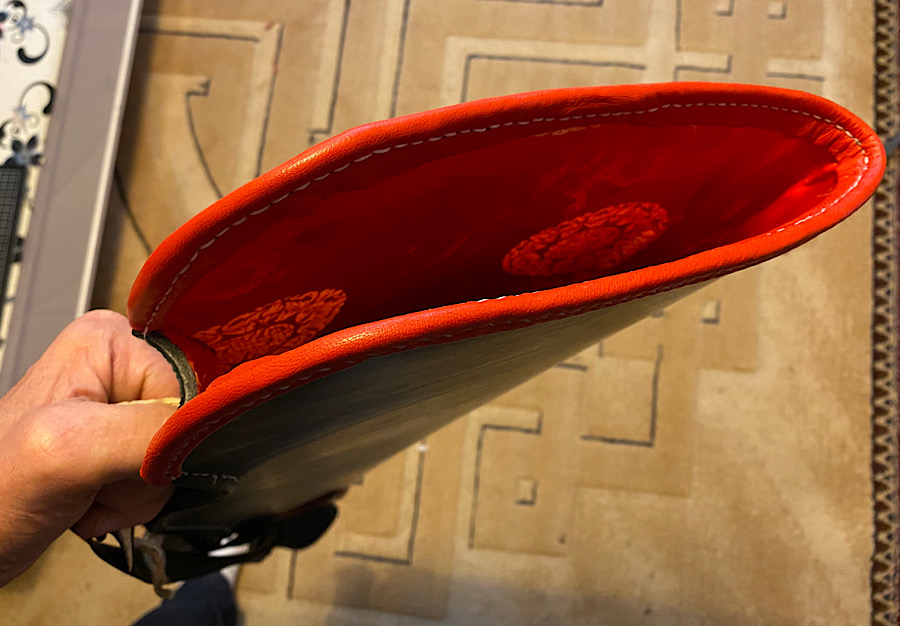 Rotes Ziegenleder. Der Köcher ist innen mit rotem Seidenstoff beklebt.
