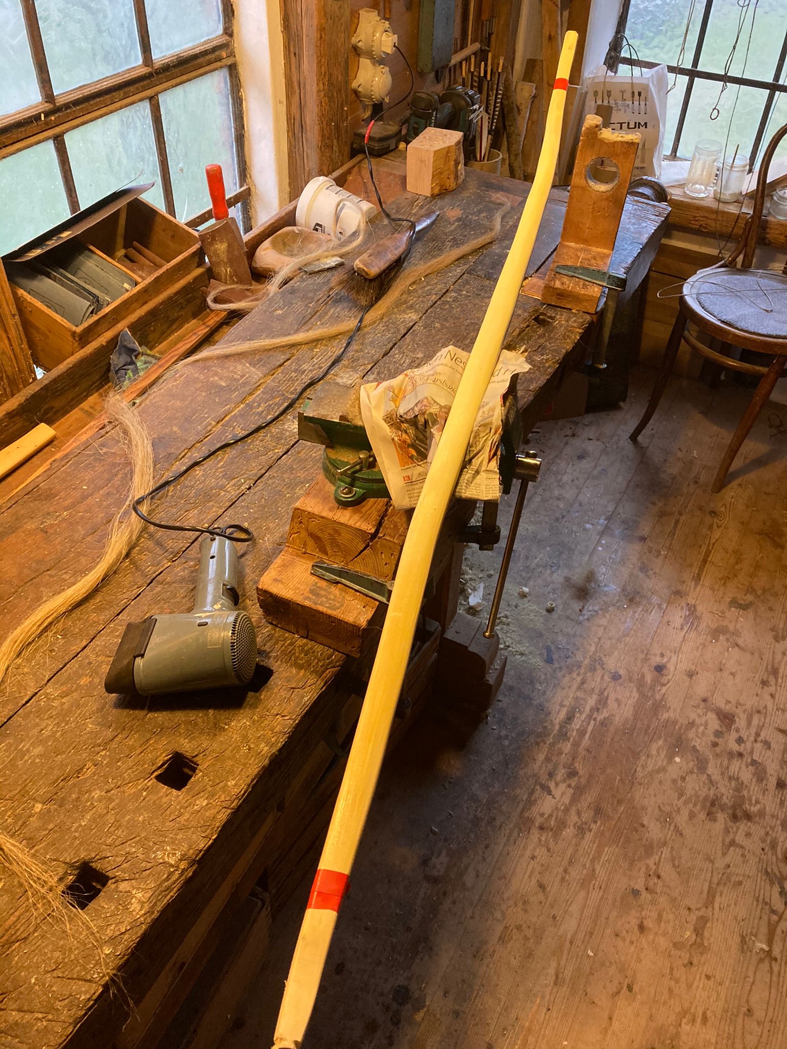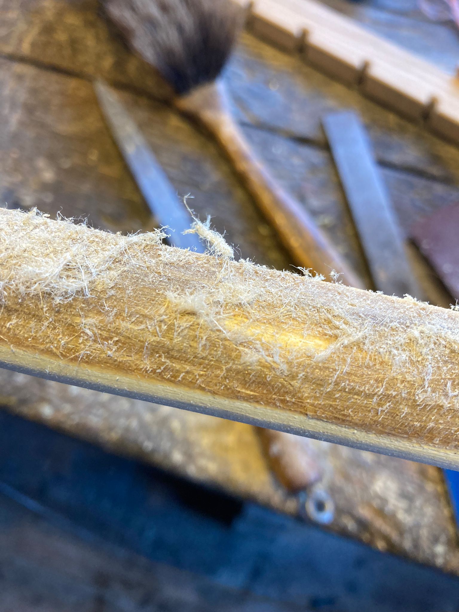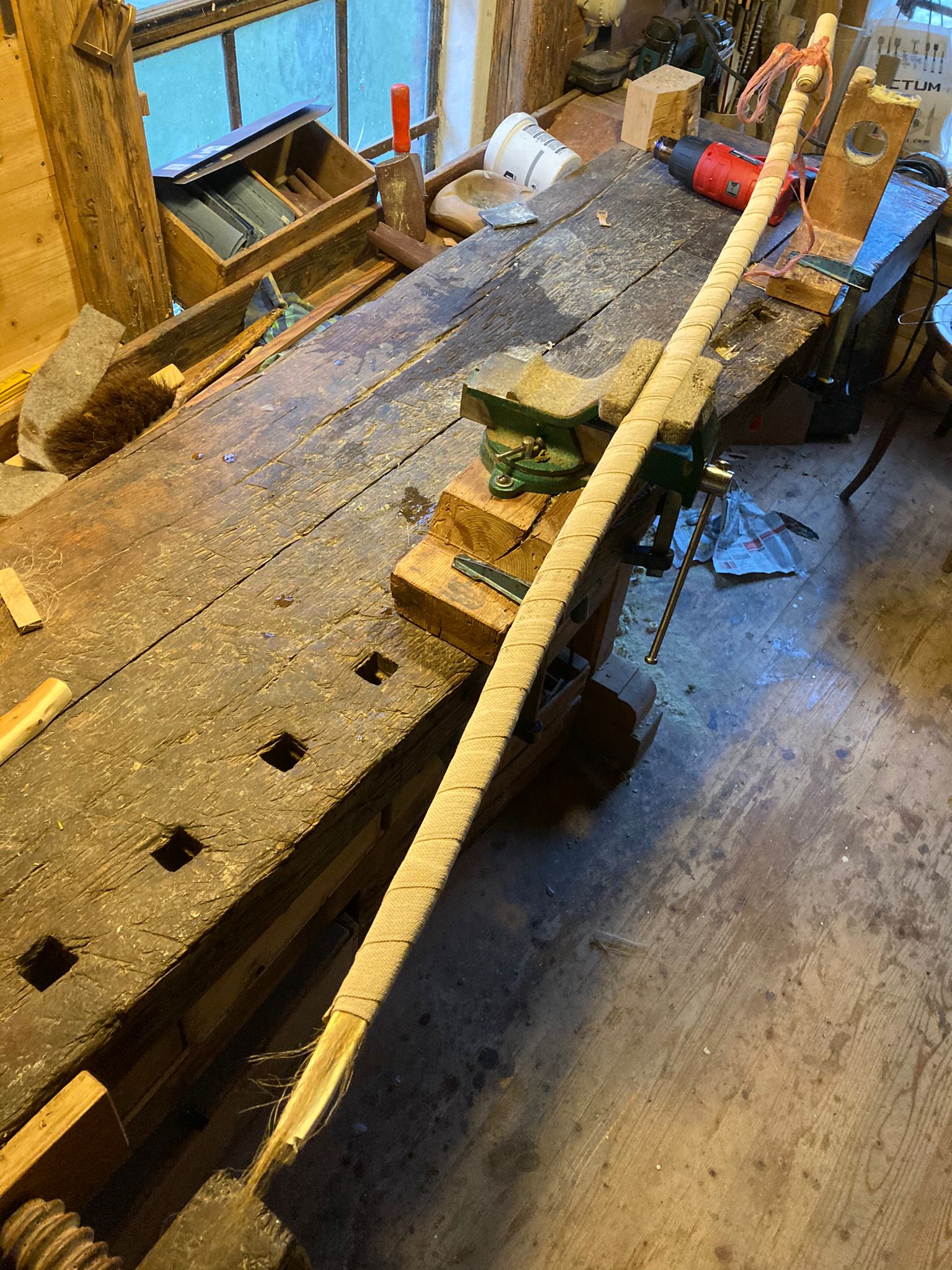 Der stave hatte sich beim trocknen noch leicht gedreht, sodass es dreier Dampfeinheiten bedurfte, um ihn halbwegs geradezubekommen und die Enden zu flippen. Davon hab ich leider keine Fotos. Gedämpft habe ich mit einem alten Tapetenablöser, dessen dampf ich in ein Rohr mit den zu biegenden Holzteilen geleitet habe.