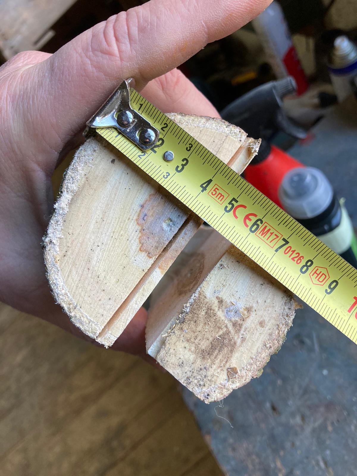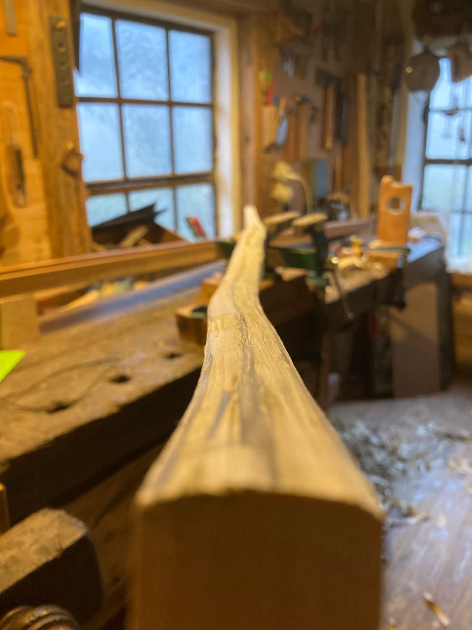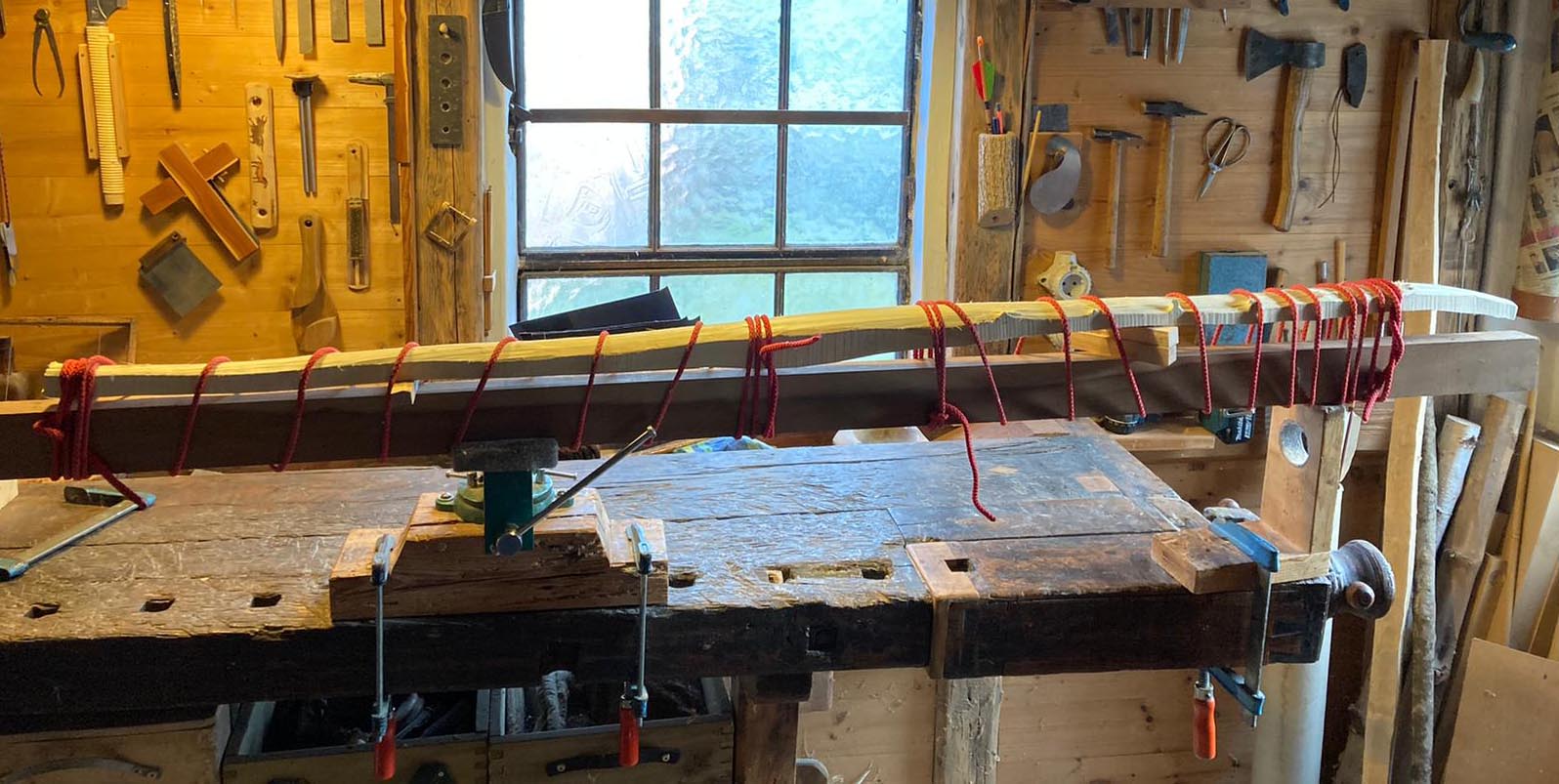 Der stave hatte sich beim trocknen noch leicht gedreht, sodass es dreier Dampfeinheiten bedurfte, um ihn halbwegs geradezubekommen und die Enden zu flippen. Davon hab ich leider keine Fotos. Gedämpft habe ich mit einem alten Tapetenablöser, dessen dampf ich in ein Rohr mit den zu biegenden Holzteilen geleitet habe.