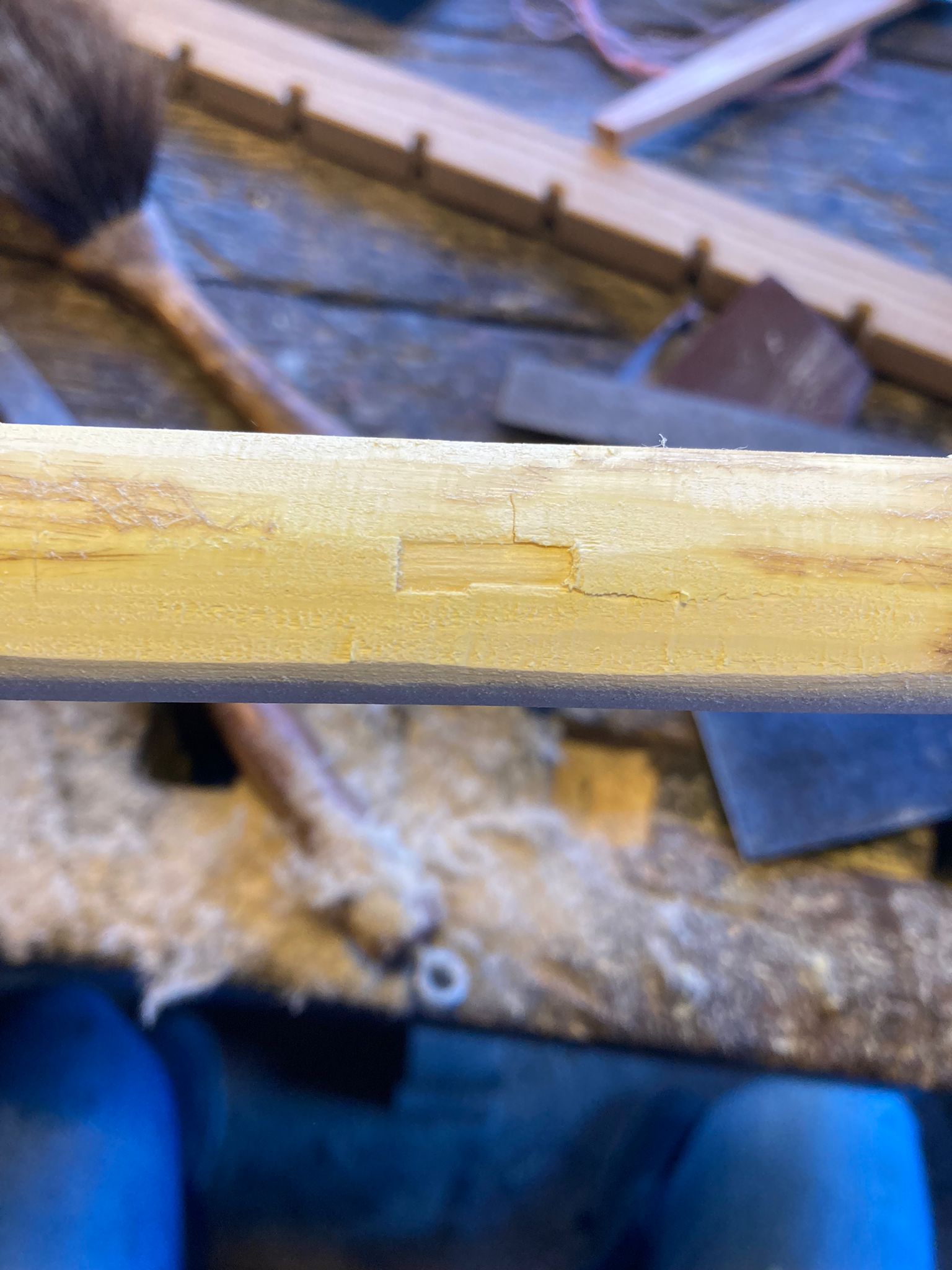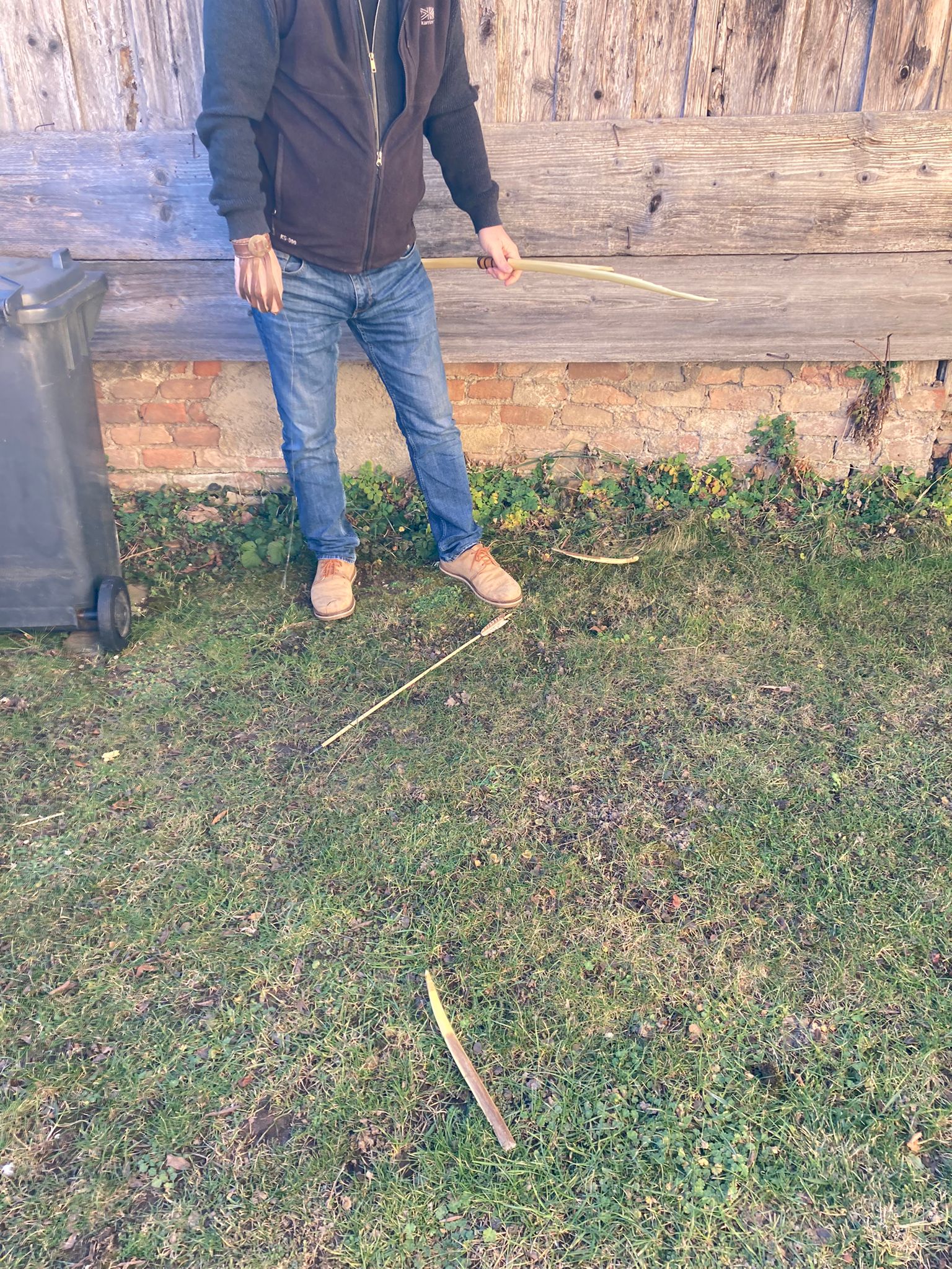 Heute beim Aufspannen des Bogens war ein knacken zu hören. Wie sich bald herausstellte war das Backing an einer Stelle im Hauptbiegebereich leicht angehoben und eingerissen. Damit das Backing nicht zu stark wird hatte ich nur eine dünne Hanflage aufgetragen. Der Schaden ist an jener Stelle aufgetreten, die beim Tillern schon als leichte Schwachstelle aufgefallen ist.