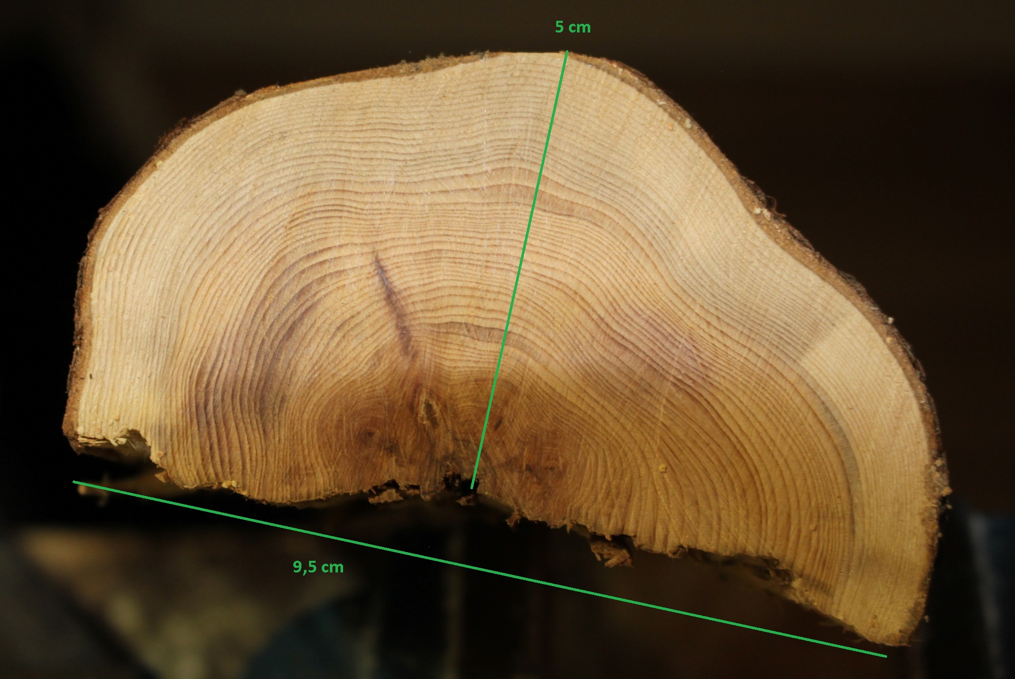 Es ist ein Halbstamm mit 135 cm Gesamtlänge, bei dem ich mich frage, ob ich eher ein oder doch zwei Billets habe, natürlich wenn keine bösen Überraschungen im Holz lauern. Splintdicke variiert zwischen 0,9 und ca 1,2 cm. Sehr helles Kernholz, vielleicht ein Männchen?