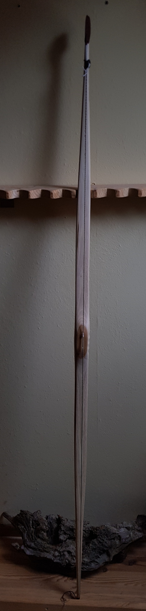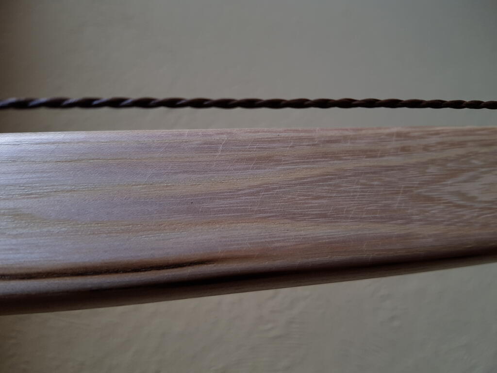 So vorsichtig wie diese Flatterulme habe ich noch nie einen Bogen getillert. Und noch nie vorher zum Ende des Tillerprozesses hin habe ich so oft Probeschüsse gemacht. Auch nach zwei Runden auf dem Parcours bleibt er stabil und wirft sauber und flott. Aber nach der Hälfte der ersten Parcoursrunde hatte er bereits über die gesamten Längen beider Wurfarme gleichmäßig Stauchfalten. Deutlich zu sehen im oberen und nur bei genauem hinsehen im unteren Wurfarm.