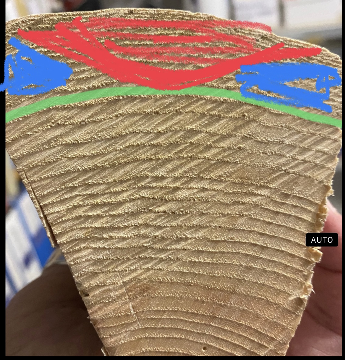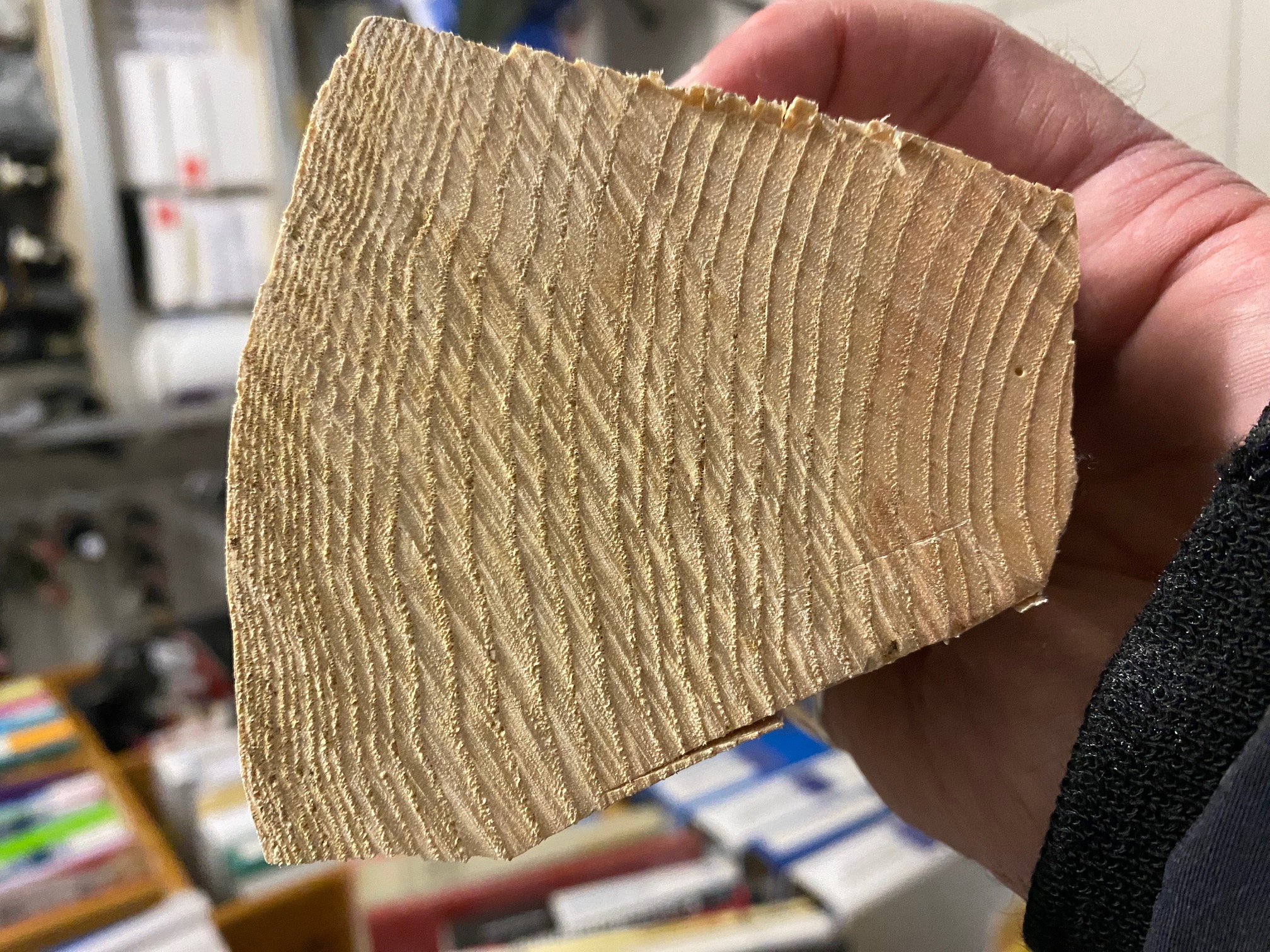 Bei dem Knubbel am Rücken hast du aber schon etwas zuviel abgetragen, die ersten Duztend Ringe sind halt sehr dünn, ich würde auf den ersten dickeren Ring gehen, ist halt etwas mehr Aufwand. Hast du schon mal Jahresringe abgetragen?