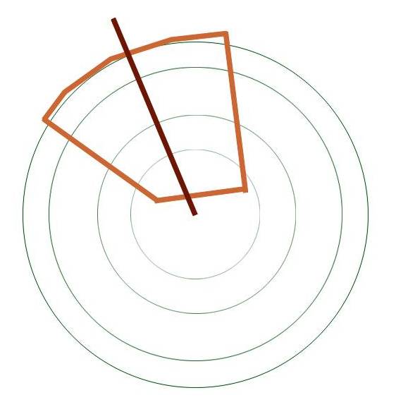 Hier eine grobe Skizze zur Vorgehensweise. Ich versuche die Jahrringe als konzentrische Kreise zu sehen, denn so in etwa war der Baum gewachsen und ziehe eine Linie vom gedachten Markkanal (Zentrum der konzentrischen Kreise) nach außen, die annähernd 90° zu den Jahrringen verläuft. Das ist dann die senkrechte Mittellinie für den Bogenstab, den ich aus dem stave schneide.