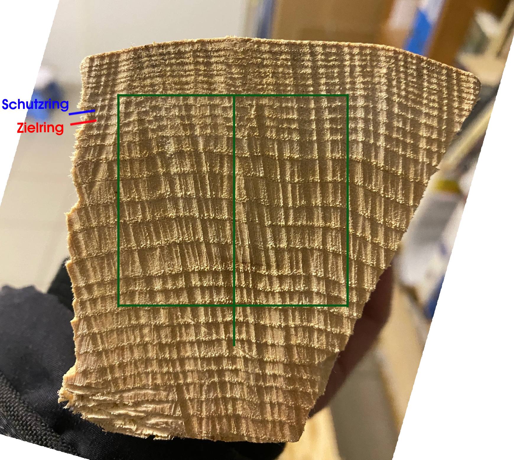 Gutes Licht ist wichtig, da musst du halt probieren wie du am besten die Ringe erkennst, und dann mit Ziehmesser an der Stirnseite die dünnen Ringe weg bis zum Zieljahresring und immer mit Ziehklinge das dünne weiche bröselige Frühholz(das Frühholz ist das mit den großen Poren) abschaben, das darunterlegende gute harte Zeugs (Spätholz) wird dann der Rücken, den ganzen Stave entlang arbeiten, ich gehe immer von der Scheitellinie in die Tiefe und dann von der Mitte zum Rand der Wurfarme, ist wie Kanalgraben oder Archäologie