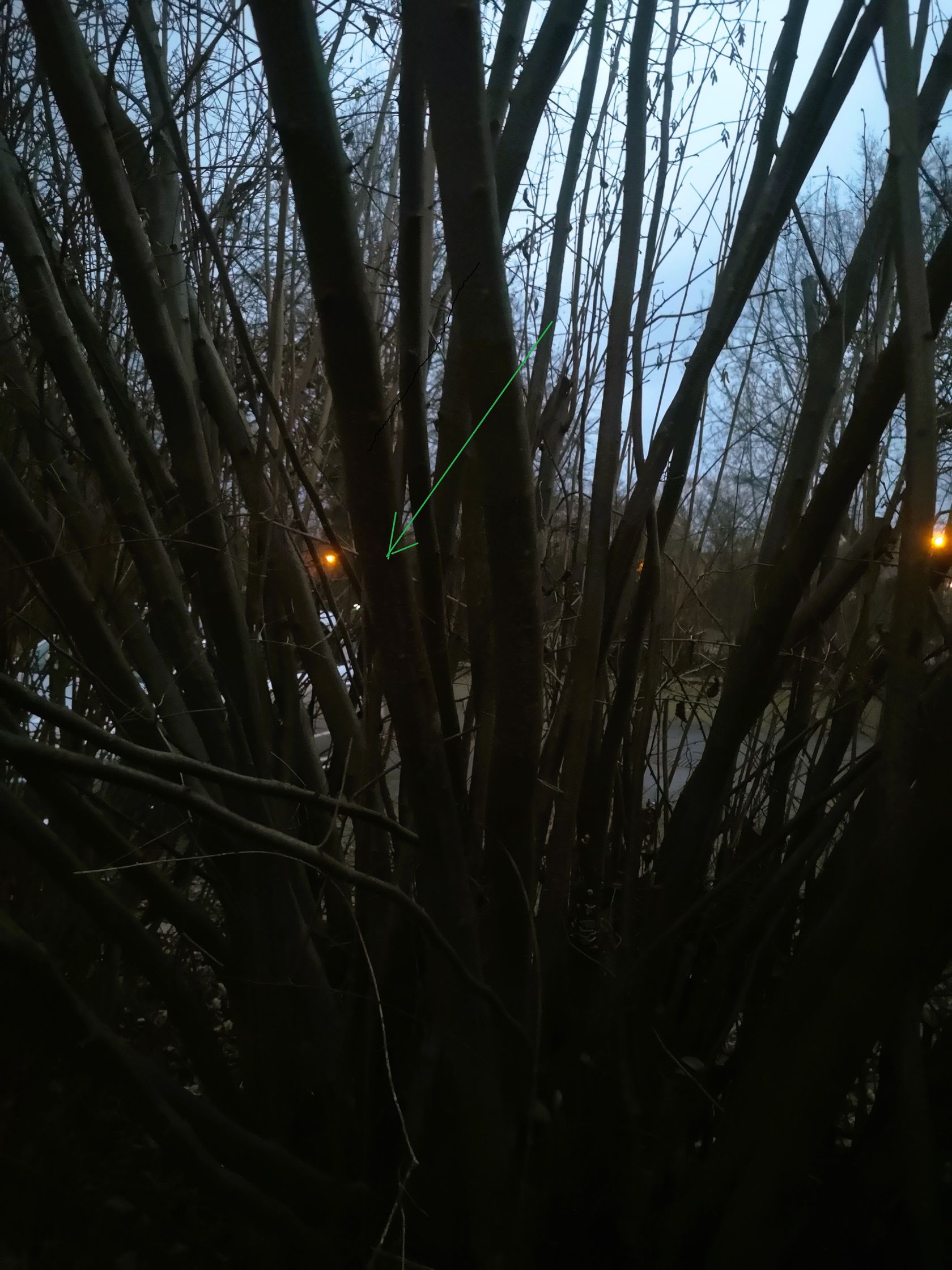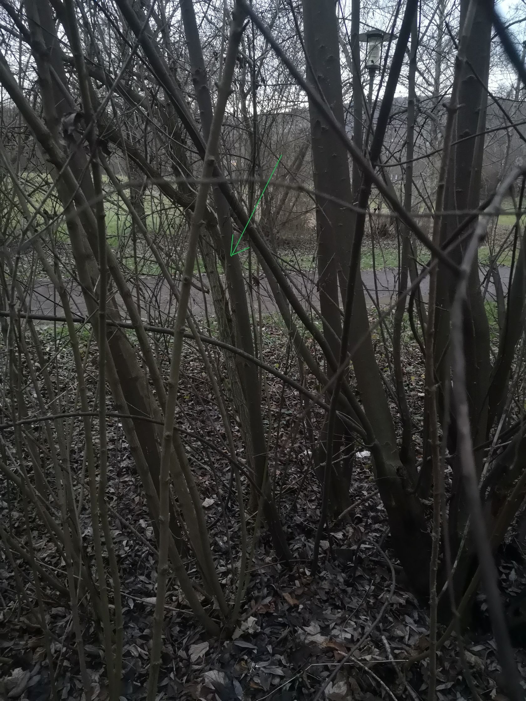 Das Bild kenne ich von Pfaffenhütchen, ich habs im Foto markiert. Zum einen die weißen Längsstrukturen in der Rinde und die hellgrünen Schößlinge.