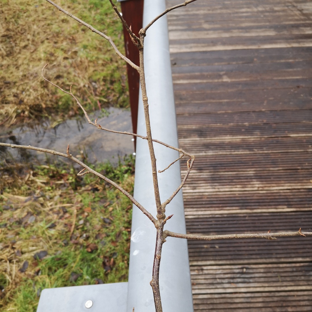 Da geb ich Dir Recht, das sind Pflaumenknospen (oder was Verwandtes), aber ich kann mir nicht recht vorstellen, dass an diesen Knospen jenes Holz dran gehangen hat. Auch der Bast von Prunusarten verfärbt sich unter Sauerstoff, das frische Holz ebenso. Der gezeigte Stab ist aber weiß. Aber vielleicht hilft nachfragen?