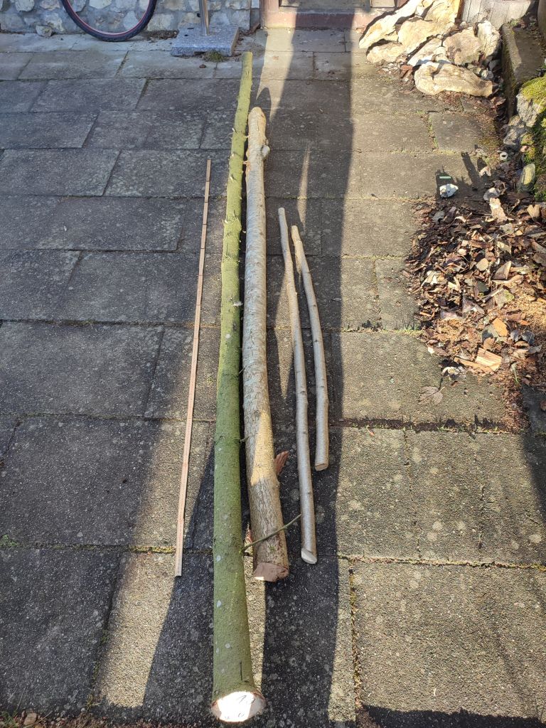Ich weis noch nicht recht , ob ich die Hasel Äste oder das Oberteil der Fichte für den zweiten innen liegenden Bogen verwende. Es wird wohl sowas wie ein Penobscot Bogen nur mit innen liegendem Bogen ...wird sehr interessant für mich werden ;D
