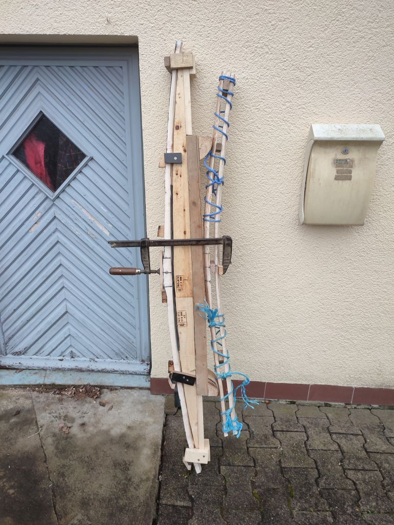 Da die Zeit ja recht begrenzt ist und ich nicht weiß, wie das mit dem Griff werden soll, habe ich versucht die Form des Innenbogens festzulegen. Danach wurde die Form erstellt und Teile der Hölzer des innen Bogens in die Form gebogen. Er ist jetzt etwas stärker gebogen, als er nachher sein wird, da er wieder etwas zurück kriechen und auch beim Tillern die Form etwas verlieren wird. Mal sehen ob das alles nachher zusammen passt ;D