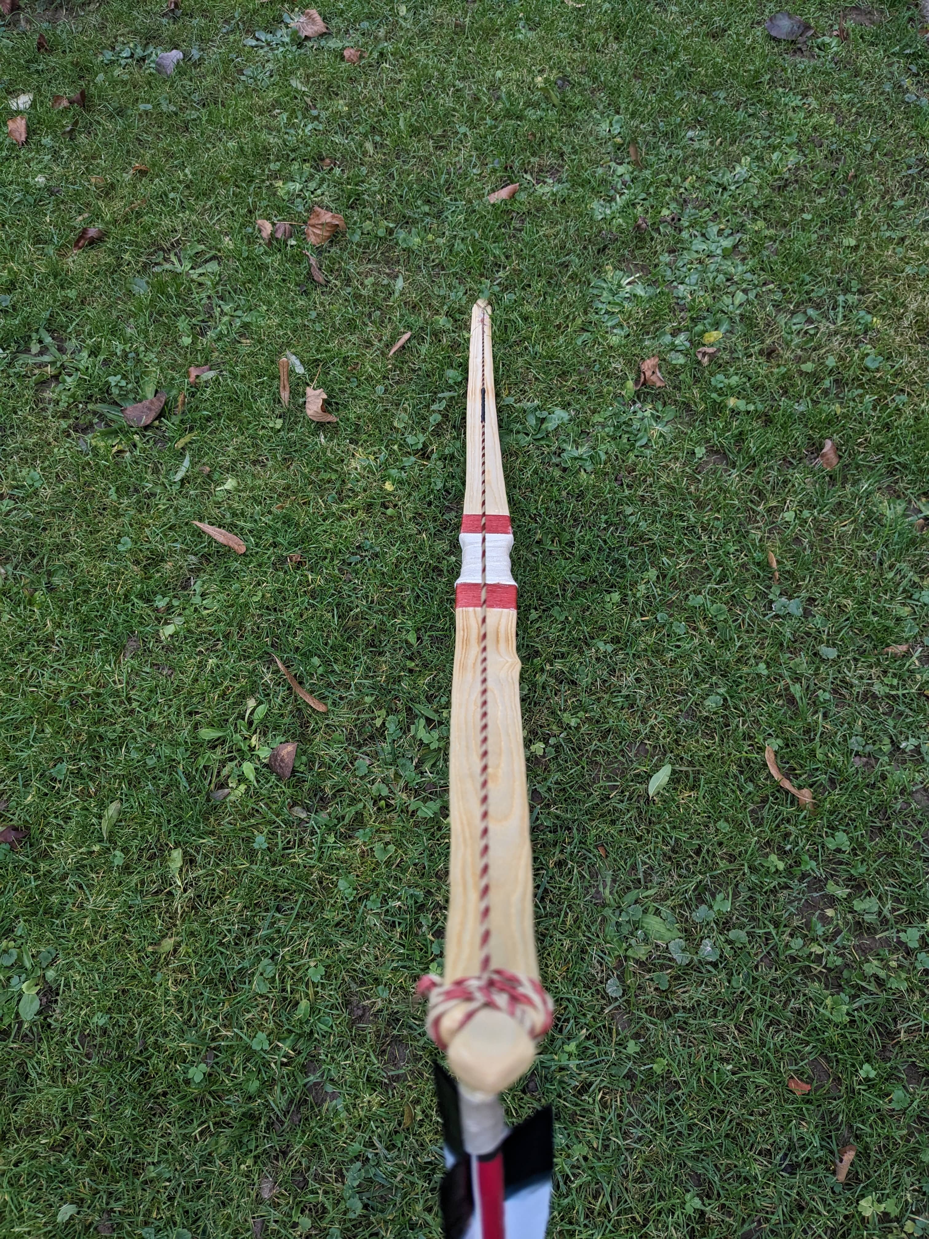 Netter Shorty, biegt halt immer noch zu stark in der Mitte. Aber 42# für das Federgewicht ist schon ordentlich. Man sieht mal wieder, dass bei Esche auch mit sehr dünnen Jahresringen Bogen gebaut werden können.