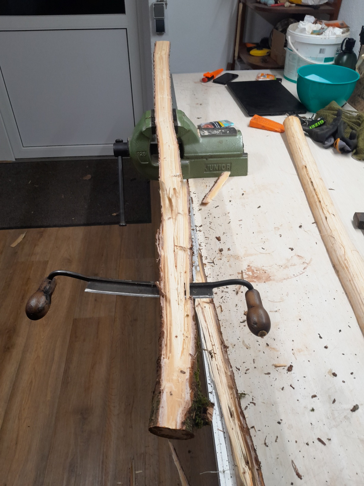 Direkt im Wald den Großteil der Rinde abgezogen und daheim gespalten. Die zwei dickeren sind haaaart an der Grenze was den Durchmesser angeht.