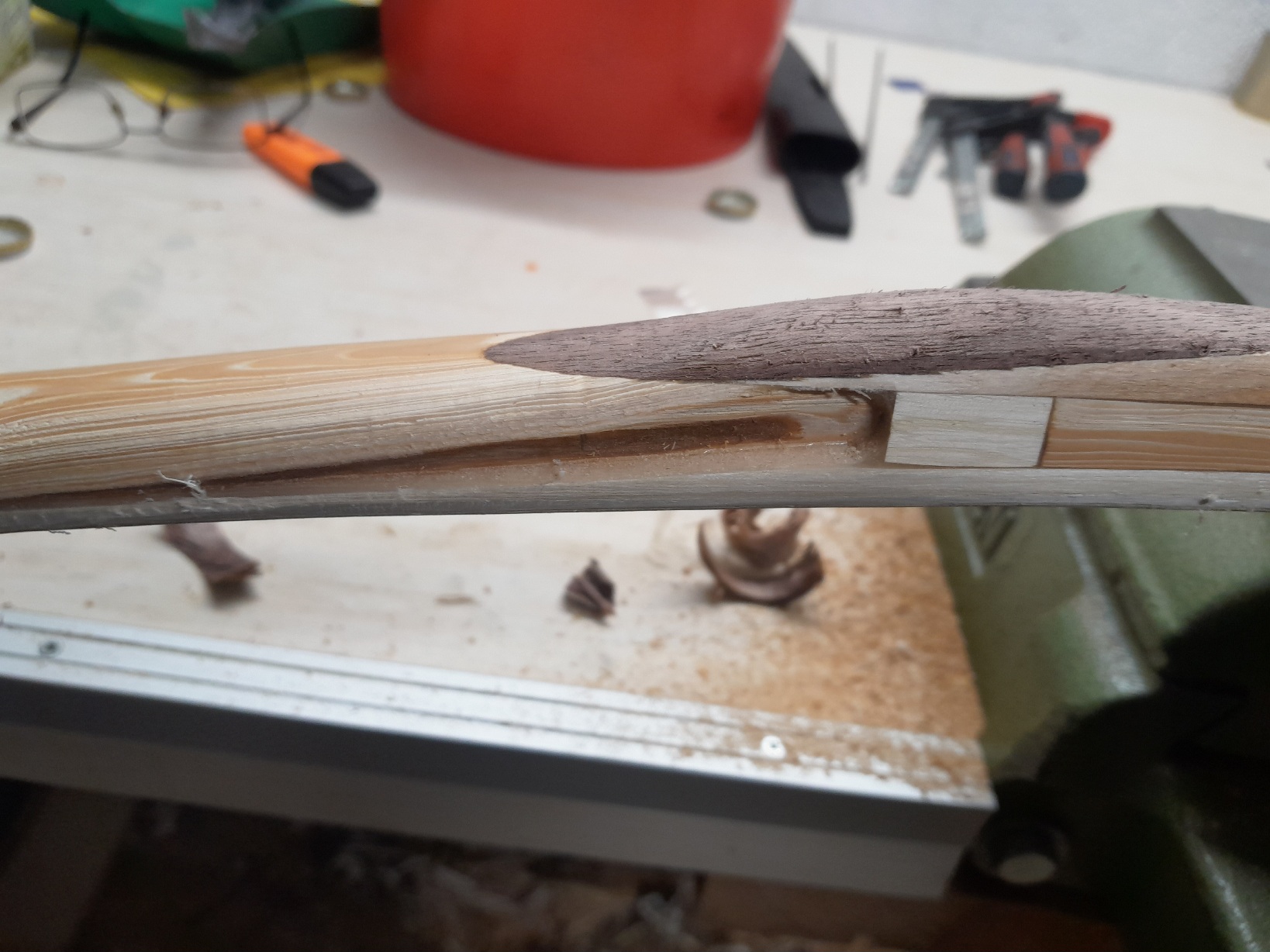 Ich habe den Griff zuerst mit einem Reststück der Ulme aufgebaut dabei aber die Klebefuge etwas versaut und deswegen ein frisches Stück Walnuss aus der Restekiste aus Frust verklebt. Da ja sogar Osage genommen werden darf dürft ihr mich gerne steinigen...