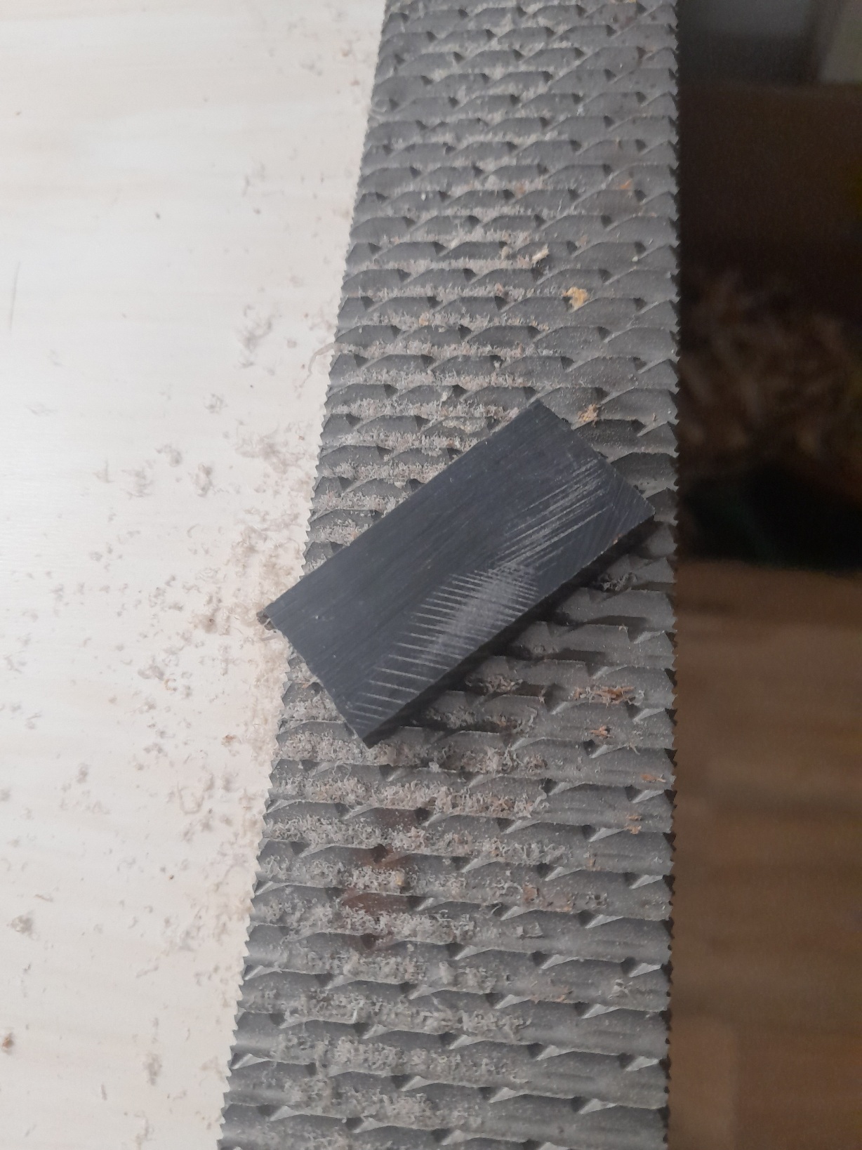 Griff grob in Form gebracht. Hier sieht man gut eines der Probleme. Eines der Fichtenlsminate hatte sich seitlich verzogen und ließ sich nicht besser verleimen. Mal schauen ob ich das ganze an der Stelle einfach schmaler mache oder noch was einklebe - wovon ich nicht ausgeh da ich kleben hasse...