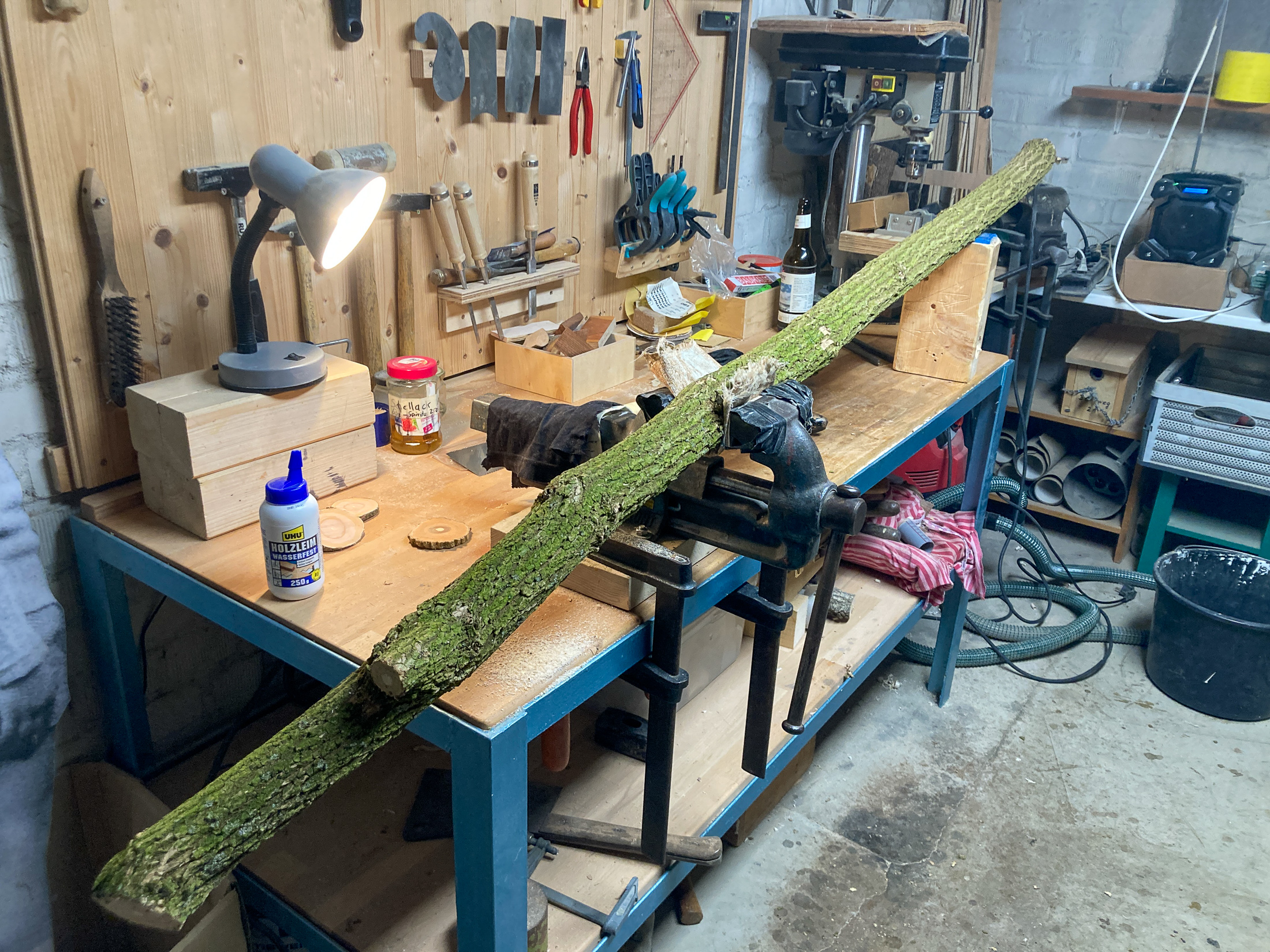 Die Buche habe ich entrindet und aufgesägt, allerdings in Billets, das lange Ding war mir auf der Bandsäge und im Lager zu unhandlich. Interessanterweise sieht der obere Teil des Stammes von Innen ganz anders aus als ich es von der Möbel-Buche kenne, alles voller Äste und Knoten - aber sehr schön! Den oberen Teil habe ich noch weiter ausgedünnt, bei den Billets vom unteren Teil steht das noch aus. Ich bin etwas ratlos wie man das am besten in Laminatform bringt. Die Enden sind versiegelt, die Äste sind mit Leim eingestrichen und die Packete zusammengezwingt, die Tage gehts weiter.
