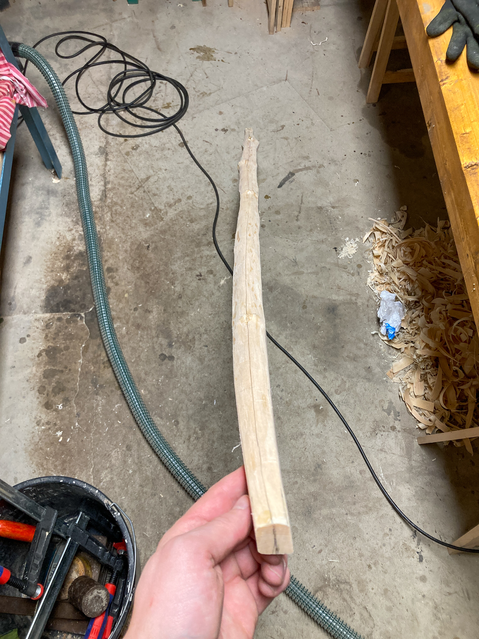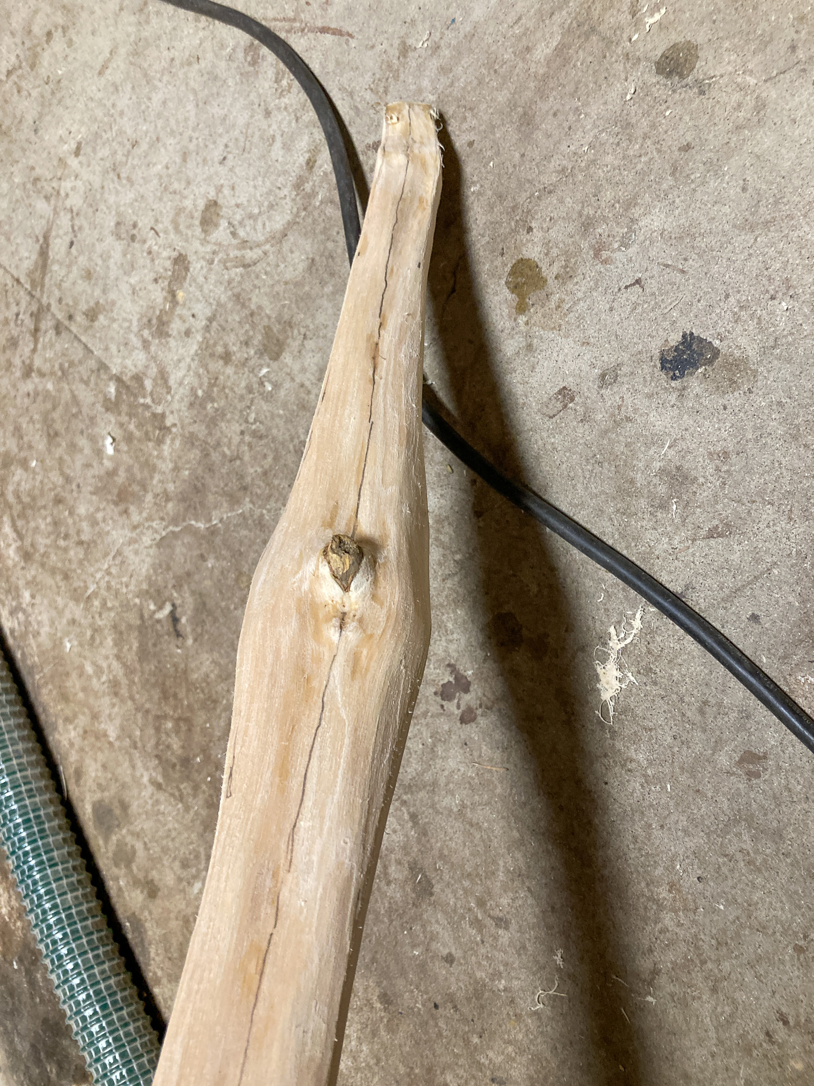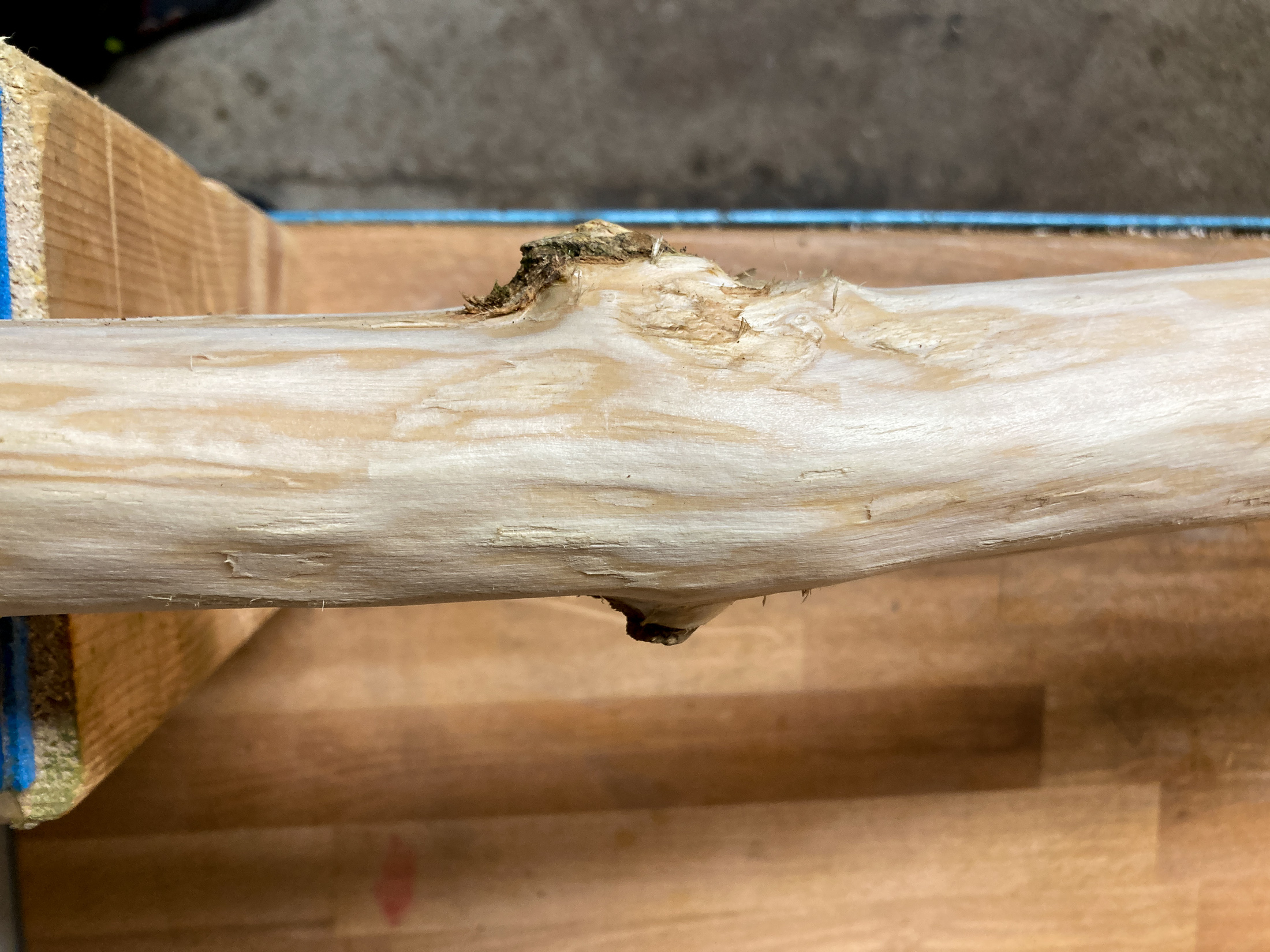 Vorhin war der Holler dran. Er hat im oberen Bereich zwei tote Äste, ich wollte den kleineren mittig im Wurfarm verbauen. Beim Aufsägen gab es leider eine kleine Überraschung: In der oberen Stammhälfte ist der Markkanal komplett vergammelt, teilweise pechschwarz. So ein Mist! Ich habe die schwarze Matsche herausgefummelt, bleibt das angegammelte Holz im Kern.