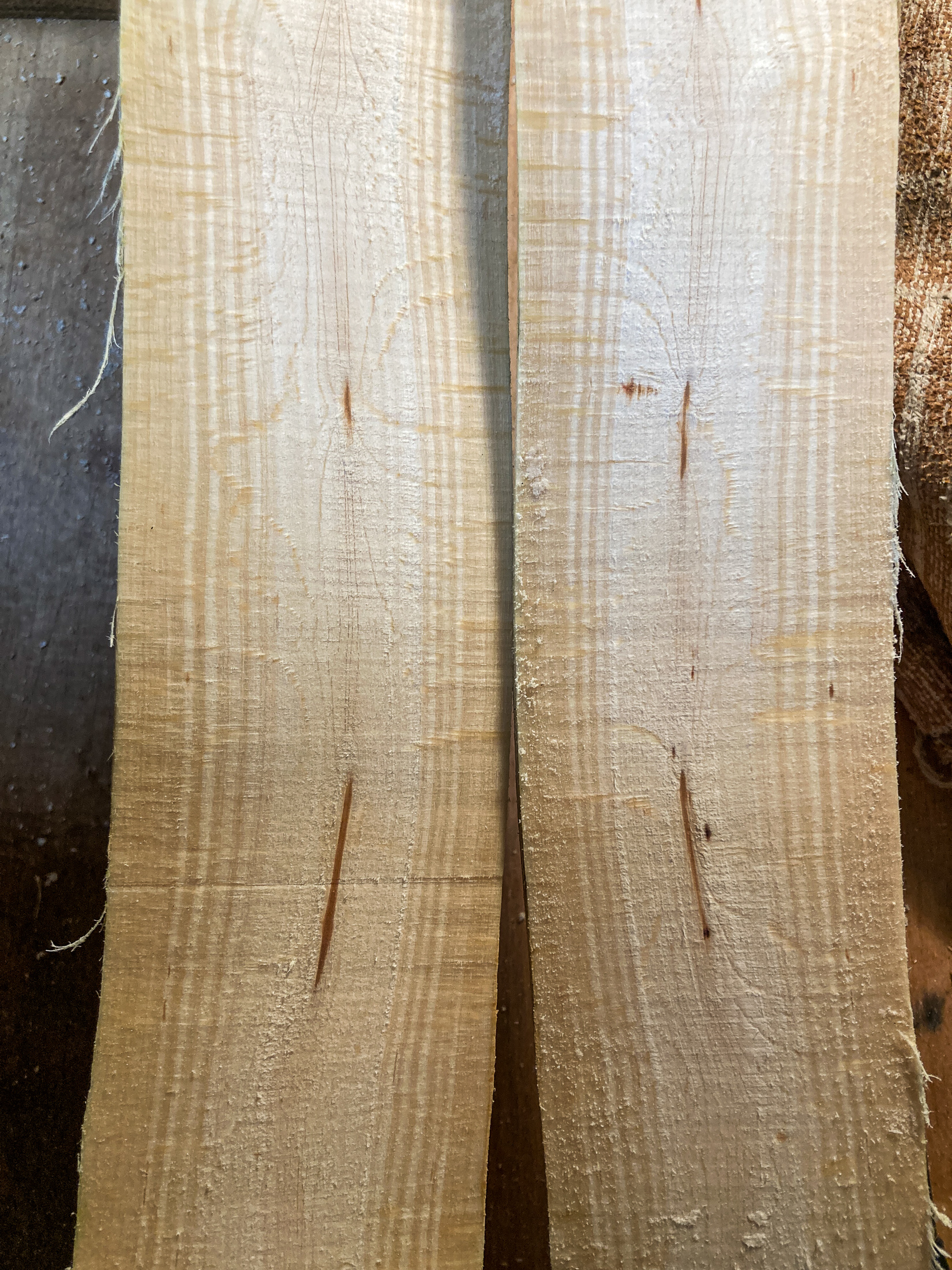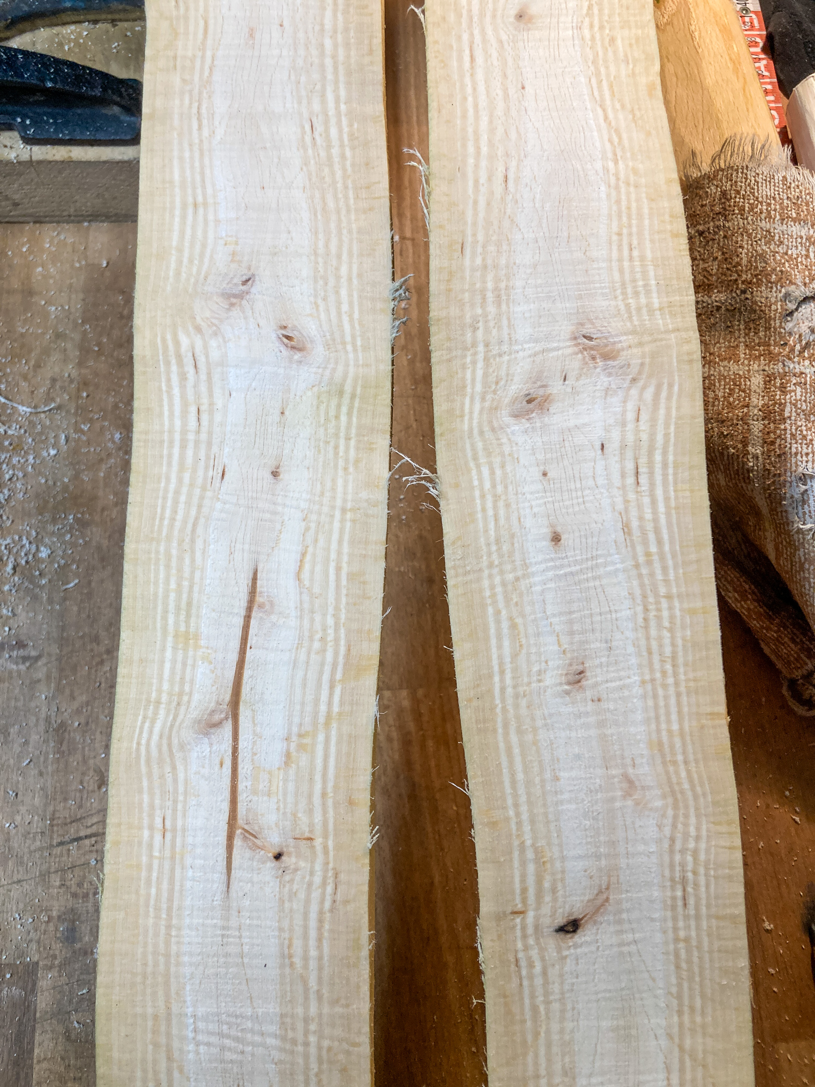 Meine Buchen-Laminate habe ich zunächst mit dem Hobel bearbeitet, aber das ist eine Katastophe und produziert nur fiese Ausrisse an den Ästen und Knubbeln. An der Bandsäge haben die beiden Stücke dann ordentlich abgespeckt und jetzt sind sie zu wieteren Trocknen auf ein Brett gespannt. Heute Abend suche ich mir noch einen Hasel für das Backing.
