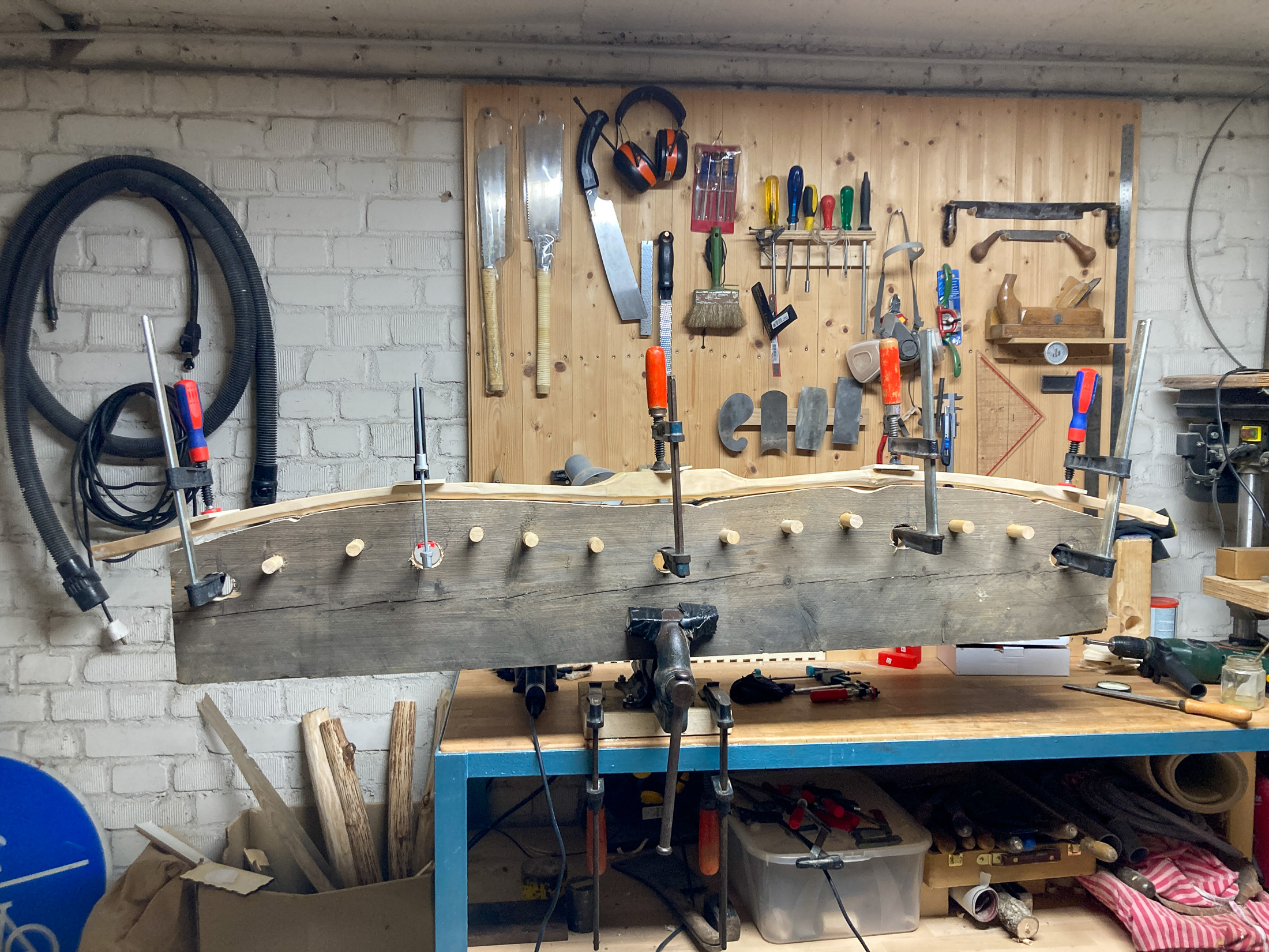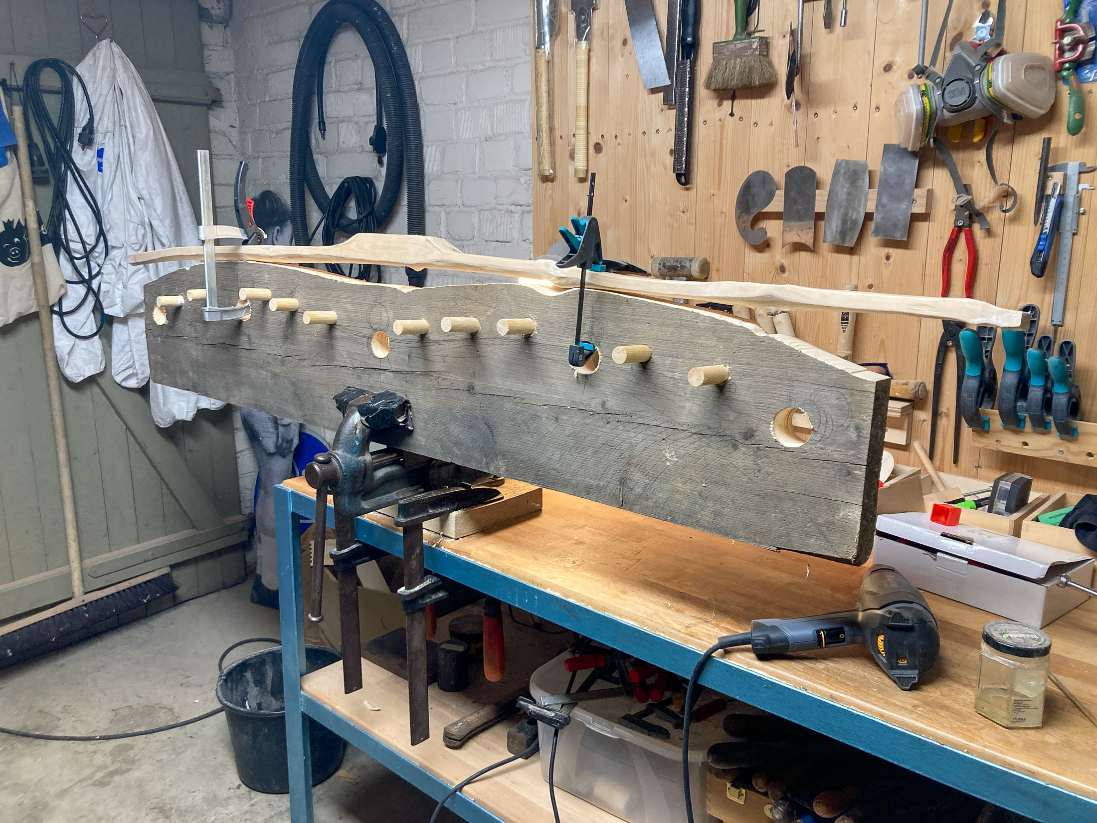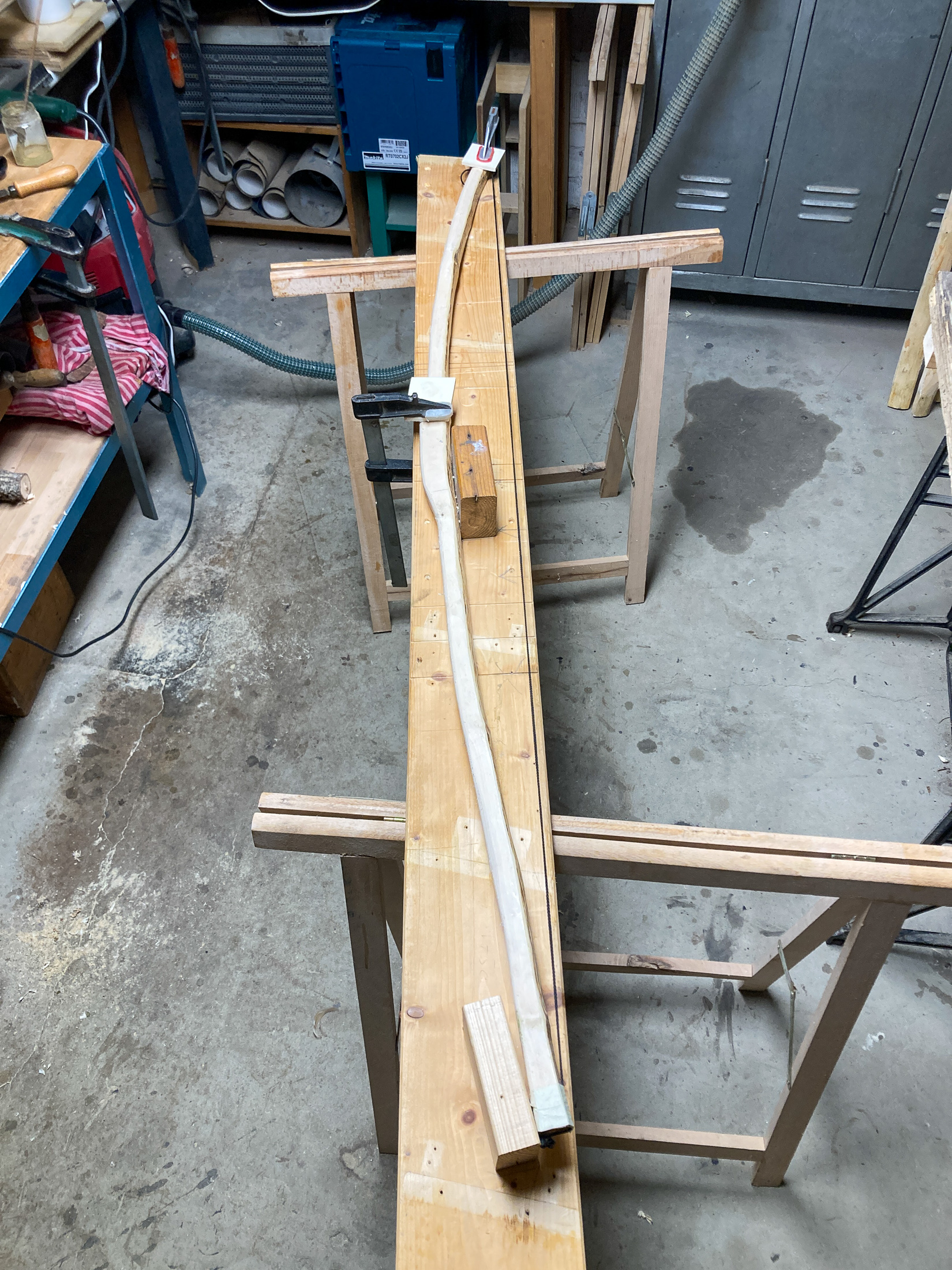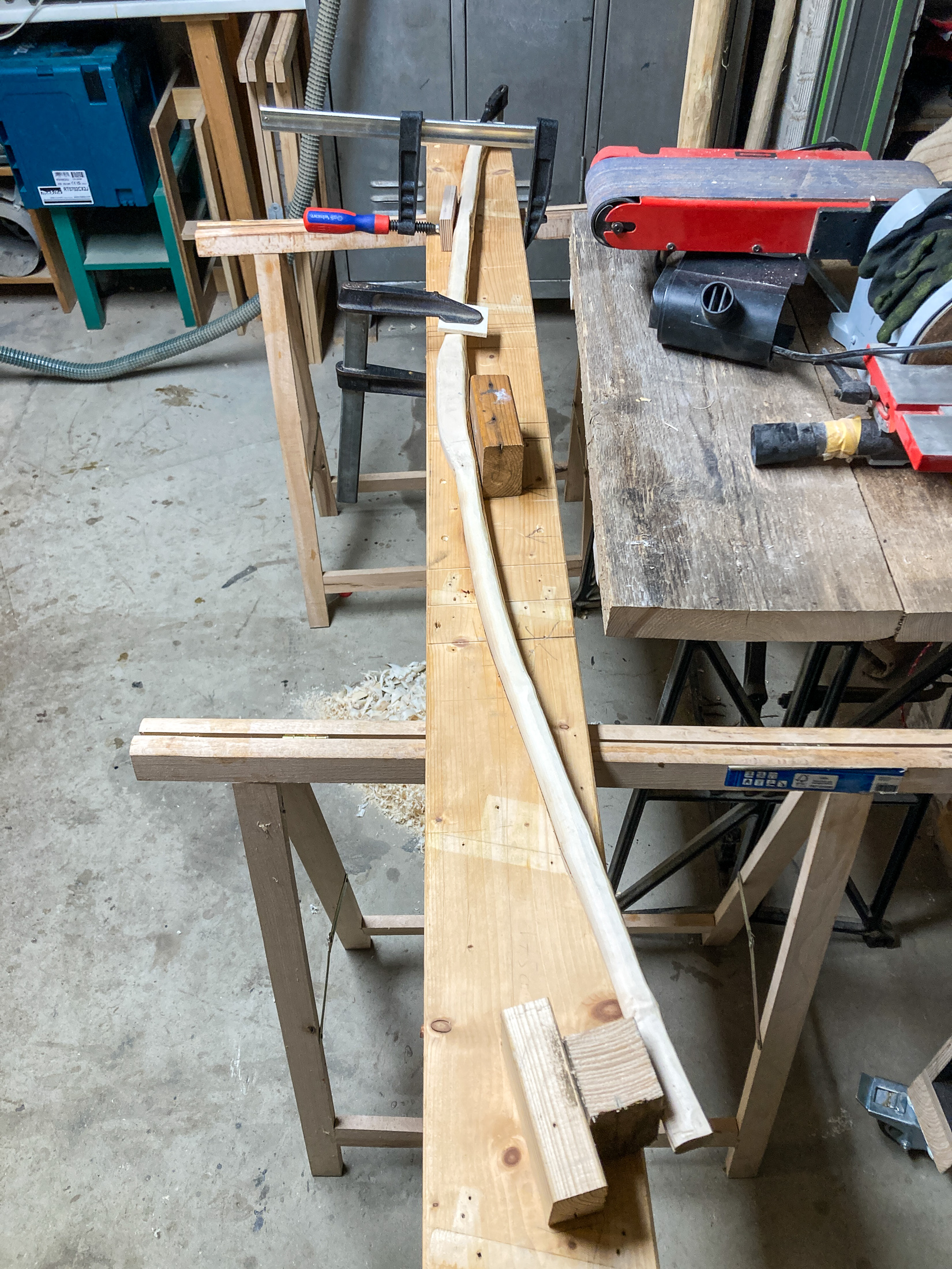 Ein bisschen lag es auch an der mangelhaften Form, grade an den Wurfarmenden wäre es praktisch zwei Zwingen ansetzen zu können. Dann kann man mit der eine Zwinge biegen und, wenn die am Ende ist, mit einer zweiten weitermachen. Oder zu zweit, das geht sicher auch besser, grade die Schraubzwingen sind alleine und teilweise mit der HLP in der Hand doch viel Rumgehampel.