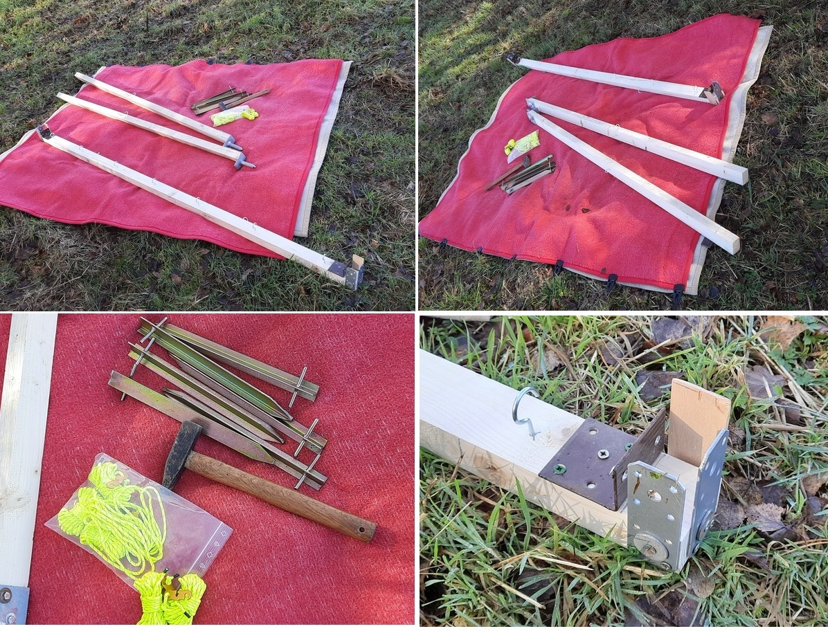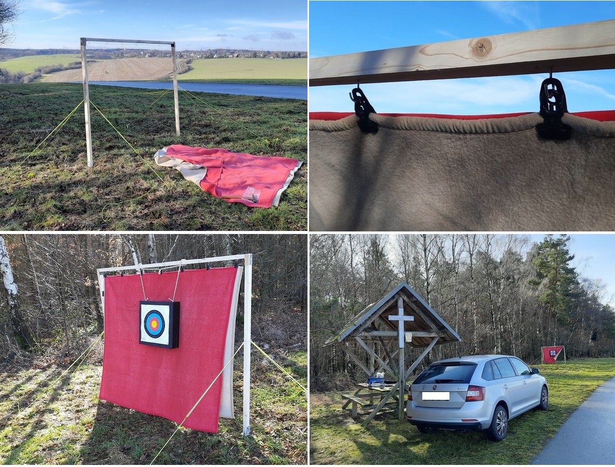Als Pfeilfang habe ich auf dem Dachboden zwei DDR-Mollydecken gefunden, aufgehangen mit Pfeilfangaufhängern (alle 40 cm) von Bogensport Beier. Die Zielscheibe ist von Temu. Metallwinkel und Locheisen sowie Schrauben und Haken hatte ich daheim. Die Latten nebst Bodenanker habe ich gekauft (Baumarkt), ebenso wie die eloxierten Zeltheringe aus Stahl und die Perlon-Zeltschnüre (beides Ebay). Wo die obere Querlatte hinten ein Lochblech hat ist vorn Sperrholz, damit der Pfeil nicht leidet, wenn er genau da drauffliegt.
