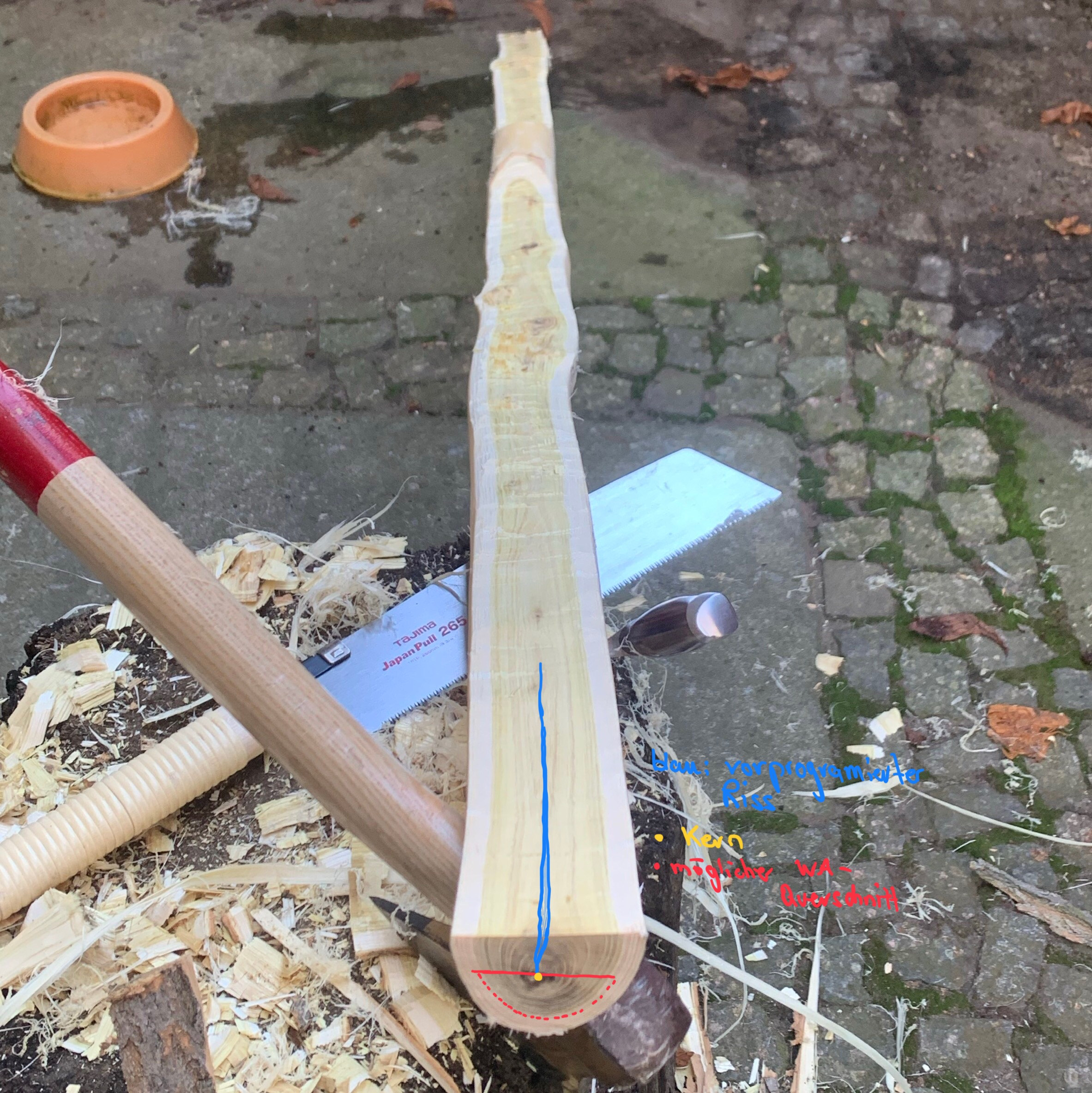 Wenn ich das richtig sehe, hast du nicht auf den Markkanal herunter gearbeitet, da ist der Riss (blau eingezeichnet) vorprogrammiert, rot markiert ist der Wurfarmquerschnitt der möglich ist, ansonsten würde ich den Ast mit viel Überlänge langsam im ganzen mit Rinde trocknen.