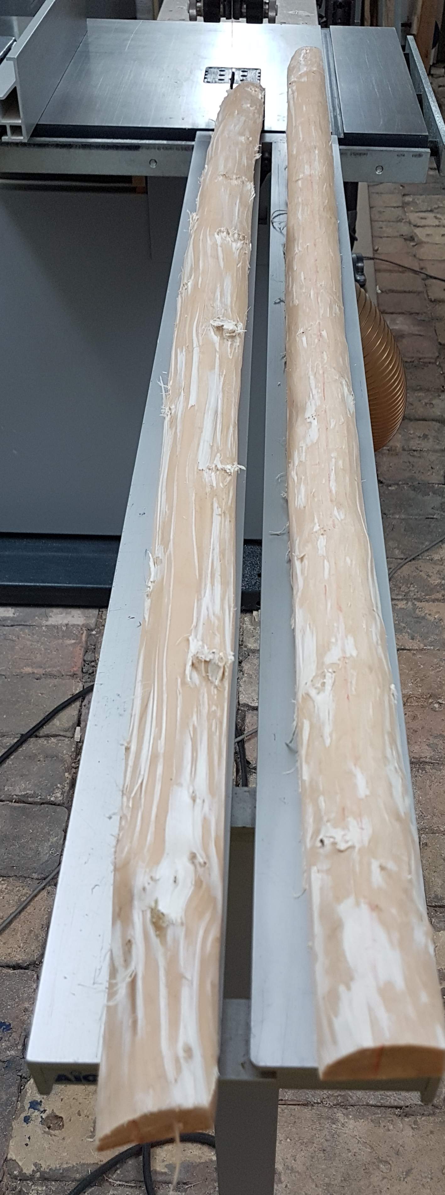 Dann wurde das lange Stück Holz in 3 kurze Stücke verwandelt und das ausgesuchte Mittelteil mit Hilfe der Bandsäge geteilt.