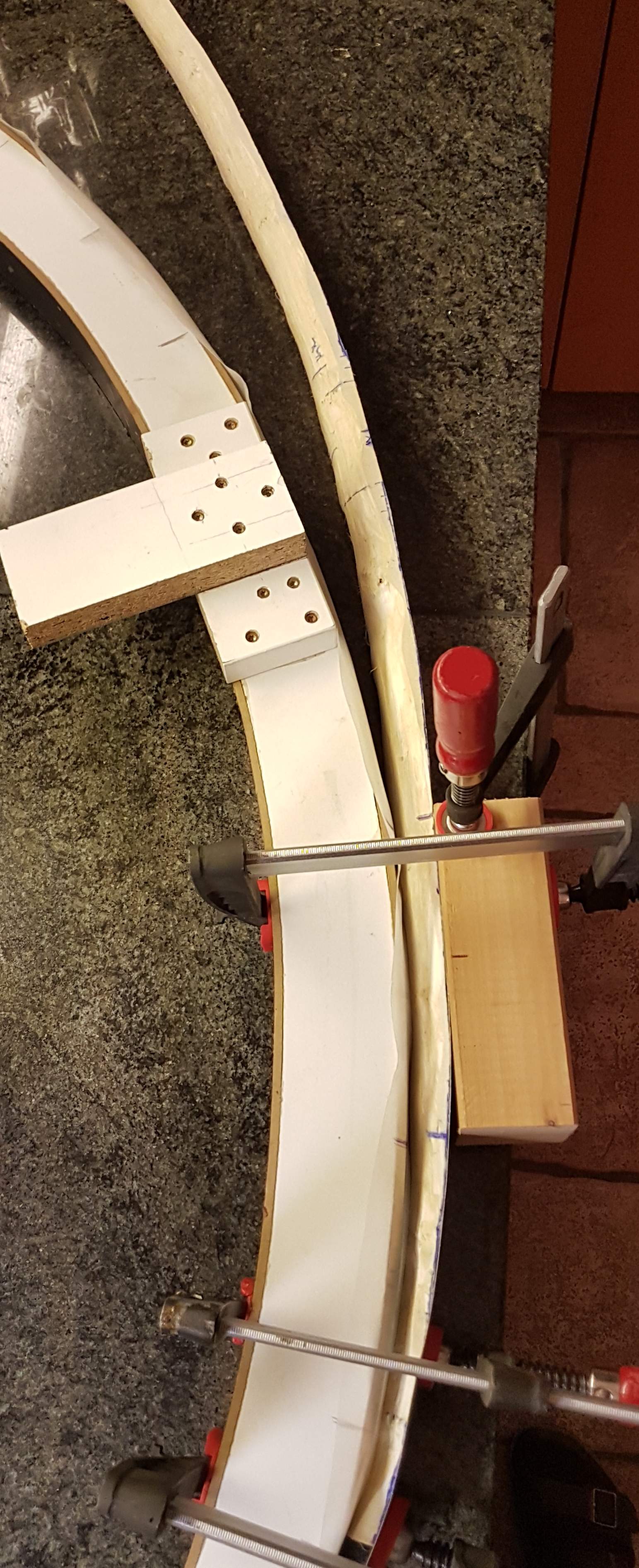 Heute wurde noch etwas Holz mit Hilfe der Bandsäge bauchseitig entfernt. Da mir der Reflex beim oberen und unteren WA zu unterschiedlich war, wurde heute 30 Min. gedämpft und gebogen. Mit dem noch relativ feuchten Holz funktioniert das hervorragend.