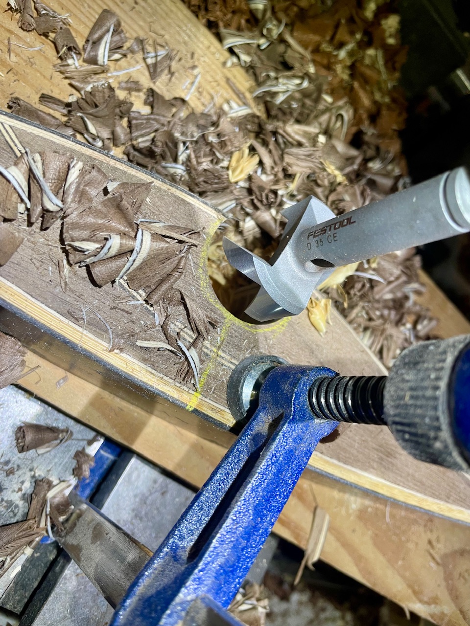 Der Pressdruck sollte auch ausreichend sein, es sind insgesamt 38 Zwingen, die ich wirklich ordentlich angezogen habe. Der Druck wird von einer Lage 5mm Vinyl auf einer Lage 3mm Dibond in den Bogen geleitet und die Form ist mit 3mm Forex gepolstert.