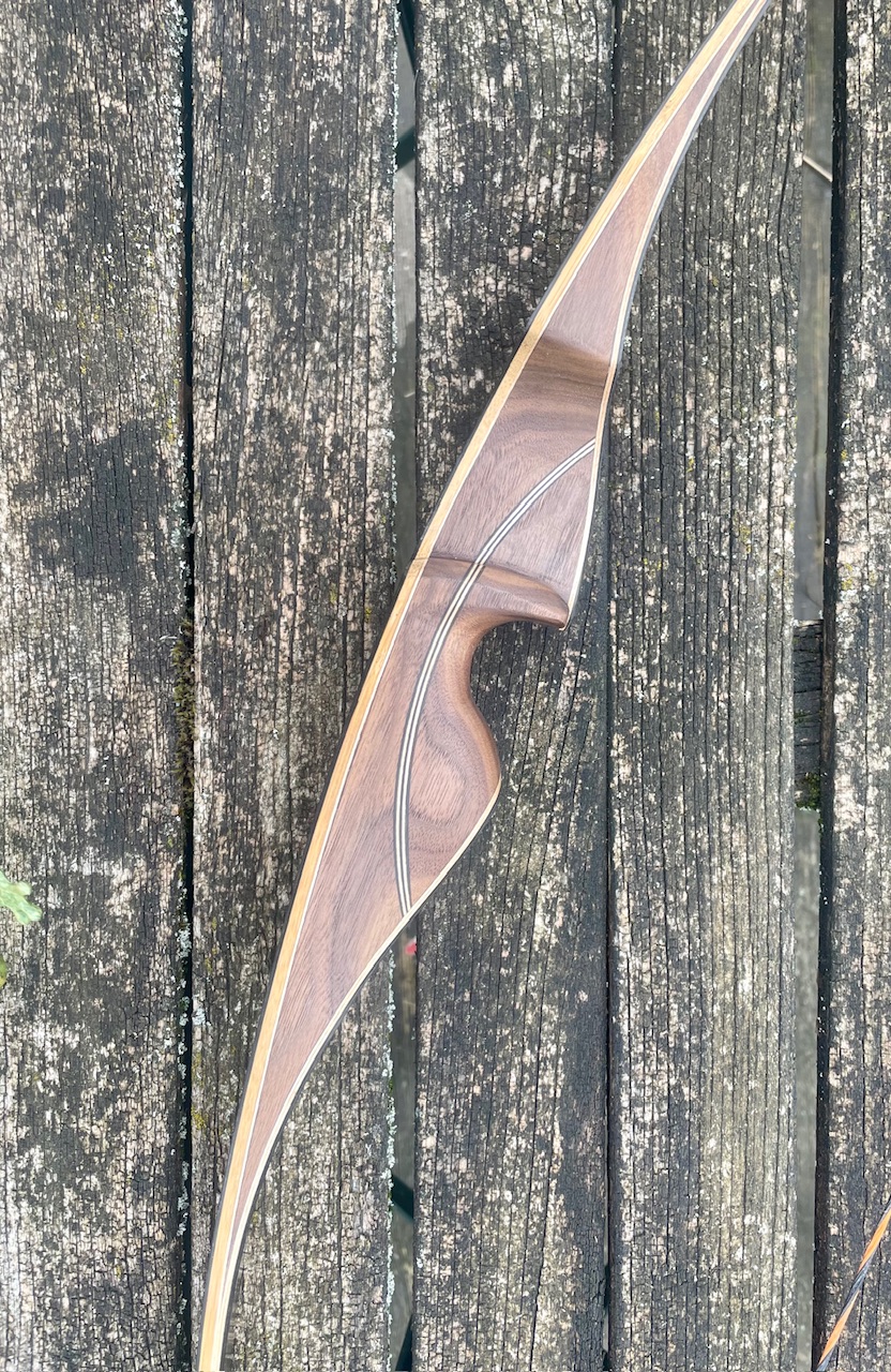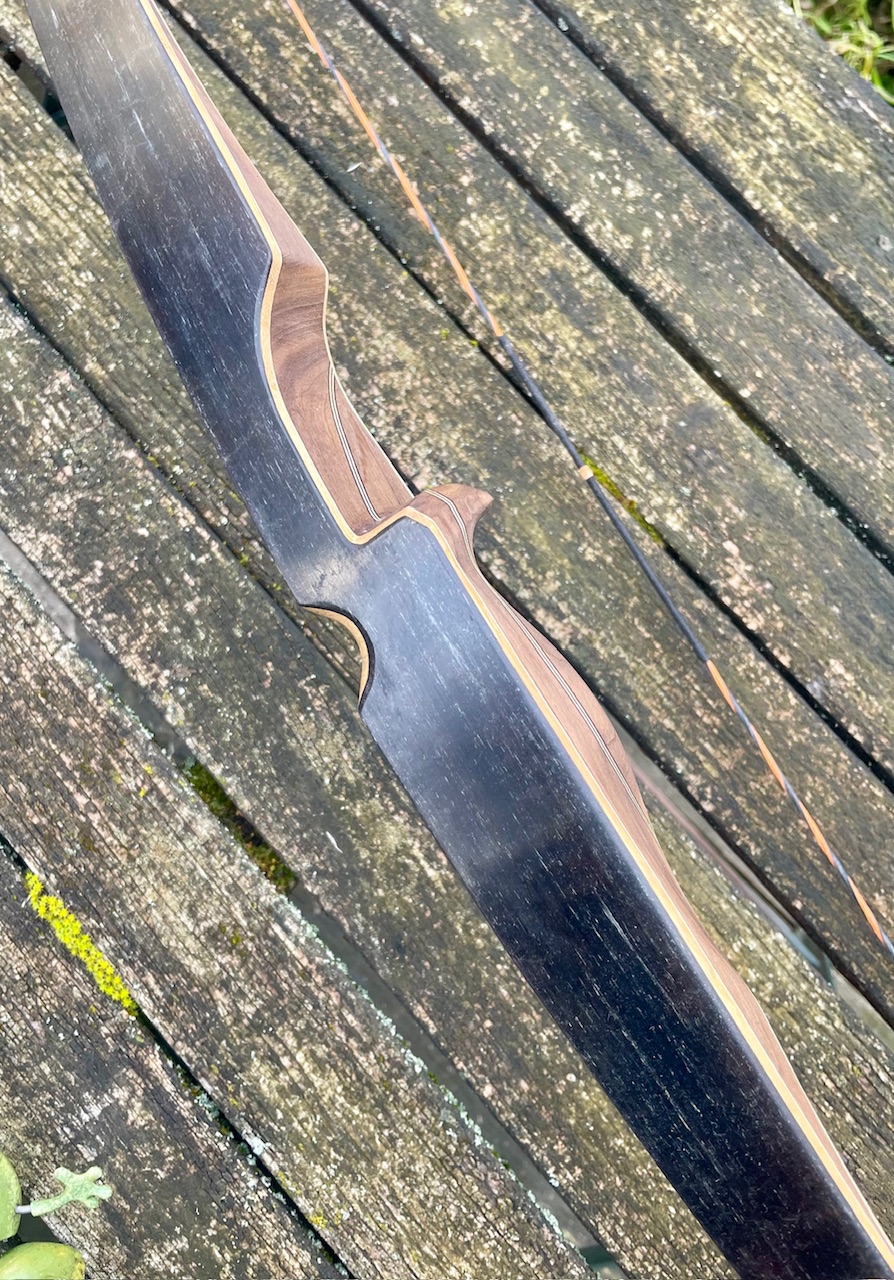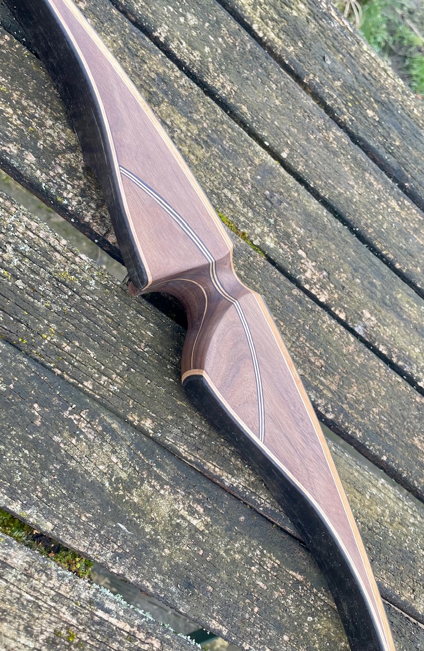 Ich habe ihn als Hybridbogen konzipiert, er hat also Reflex/Deflex und das Schussfenster ist auf Mitte geschnitten. Der tiefste Punkt der Handauflage ist exakt die Mitte des Bogens und der höchste Punkt der Pfeilauflage liegt direkt darüber.