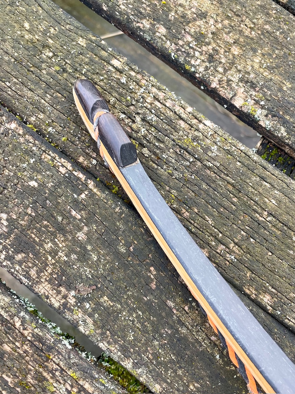 Den Griff habe ich so gestaltet, daß wenn ich den Bogen locker greife und den Zeigefinger ausstrecke, der Finger genau in einer Linie mit dem Pfeil liegt. Ich stelle mir vor, daß mir instinktives Schießen so einfacher fallen könnte.