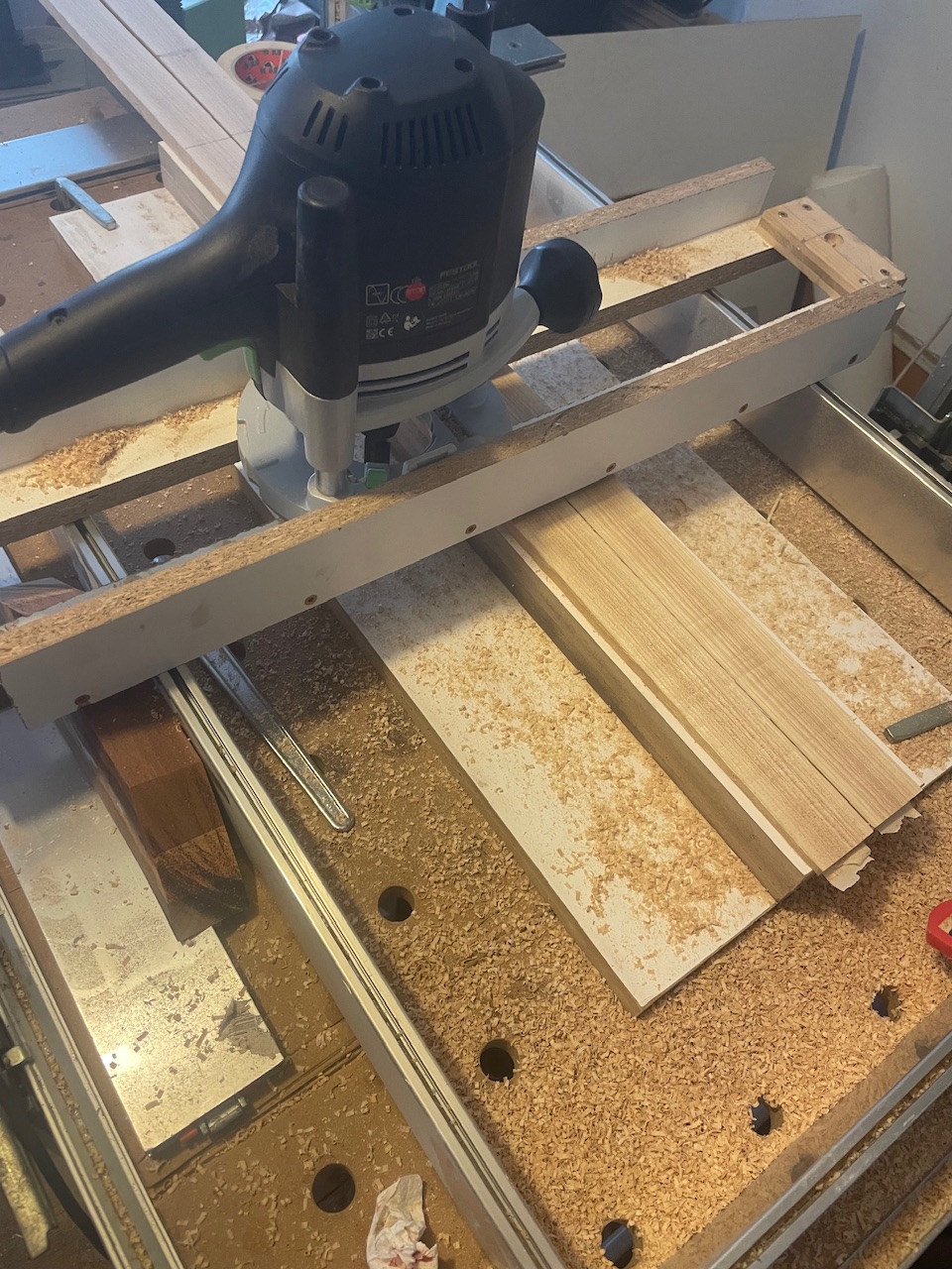 Die Hickoryteile sind mit Kreppband und Sekundenkleber befestigt und die Schienen, auf denen der Frässchlitten sitzt, sind mit 10mm auf 1m angewinkelt