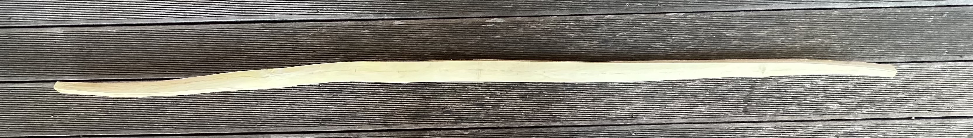 Habe einen Robinienbogen in Arbeit. Geerntet im März 2025, Holzfeuchte derzeit 13%, 90 Grad verdreht, dicke Splint-Kernholzringe, geplant ist ein Semi-Pyramidalbogen mit Splintring am Rücken. Die äußeren Splintringe sind gerissen, habe auf den letzten Splintring herunter gearbeitet, nur mehr wenige zarte Risse sind verblieben, der Bogen ist grob ausgeschnitten und der verschliffene Rücken mit Schellackwachs eingestrichen. Bogenlänge derzeit 2m. Jetzt muss er noch weiter trocknen. Meine Fragen sind: wie dick darf der Splintring sein? (Das Splintholz ist sehr zäh und elastisch), sind die dicken Jahresringe gut bei Robinie? Geplant sind ein Trapping und ein flacher Bogenbauch. Der Totast fällt beim Verschmälern weg. Glück gehabt.