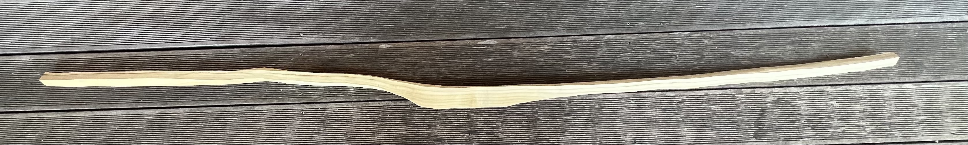Ich werde den Bogen zunächst symmetrisch bauen und belasse ihn bei 2m, den Griffbereich und die Bogenenden lasse ich anfänglich breit, ich weiß ja noch nicht wie sich der Propeller genau verhalten wird, die Wurfarmenden bleiben steif (15cm), der Griff und die Fadeouts werden eine Länge von 7cm plus 11cm plus 7cm haben. Semipyramidales Design: die Wurfarme sollen im mittleren Drittel am meisten biegen (Mantratiller), am Bauch soll -wie Benedikt auch schon gesagt hat- ein durchgehender Jahresring sein, den Bauch mache ich komplett flach, Tillern werde ich daher vor allem über die Breite und durch das Trapping. Dann schaue ich, wie auf Standhöhe bei neutralem Tiller die Sehne läuft und korrigiere die Sehnenlage über die Wurfarmenden und den Griff. Dann teste ich im Auszug welcher Wurfarm oben sich am angenehmsten verhält und kürze dann den unteren um 3-4 cm, damit sollte sich automatisch ein positiver Tiller einstellen.