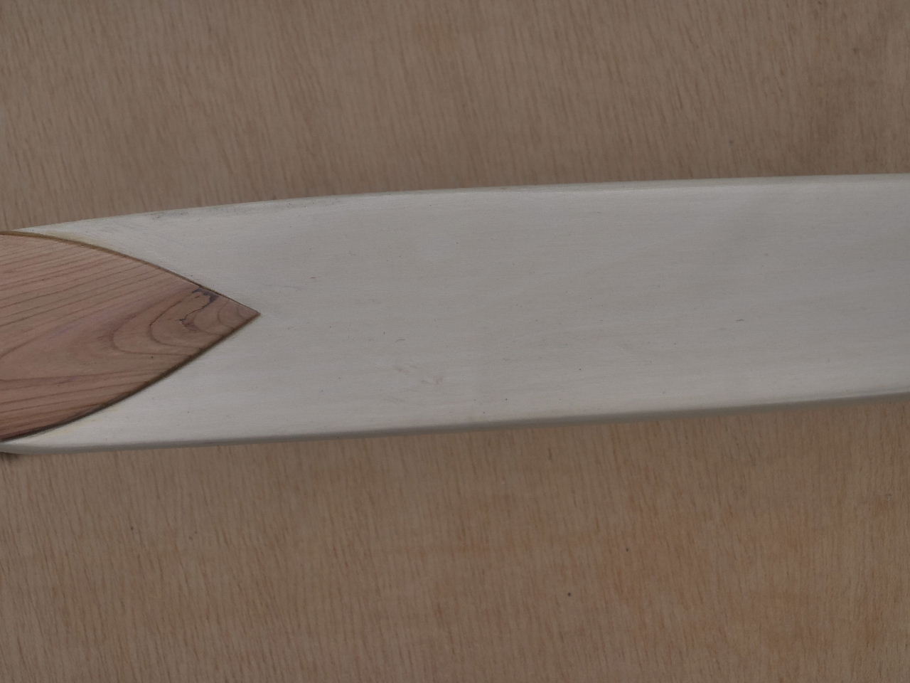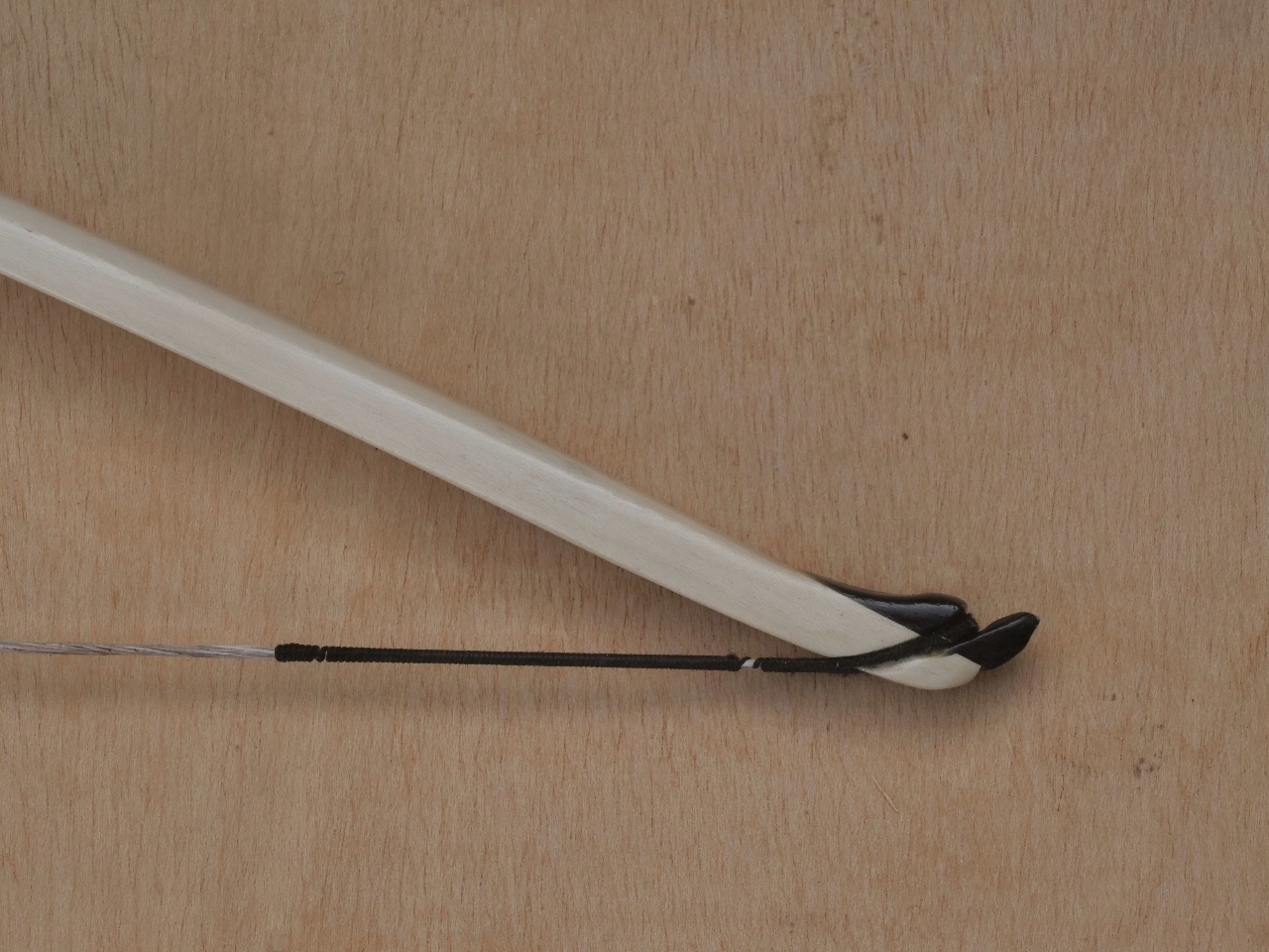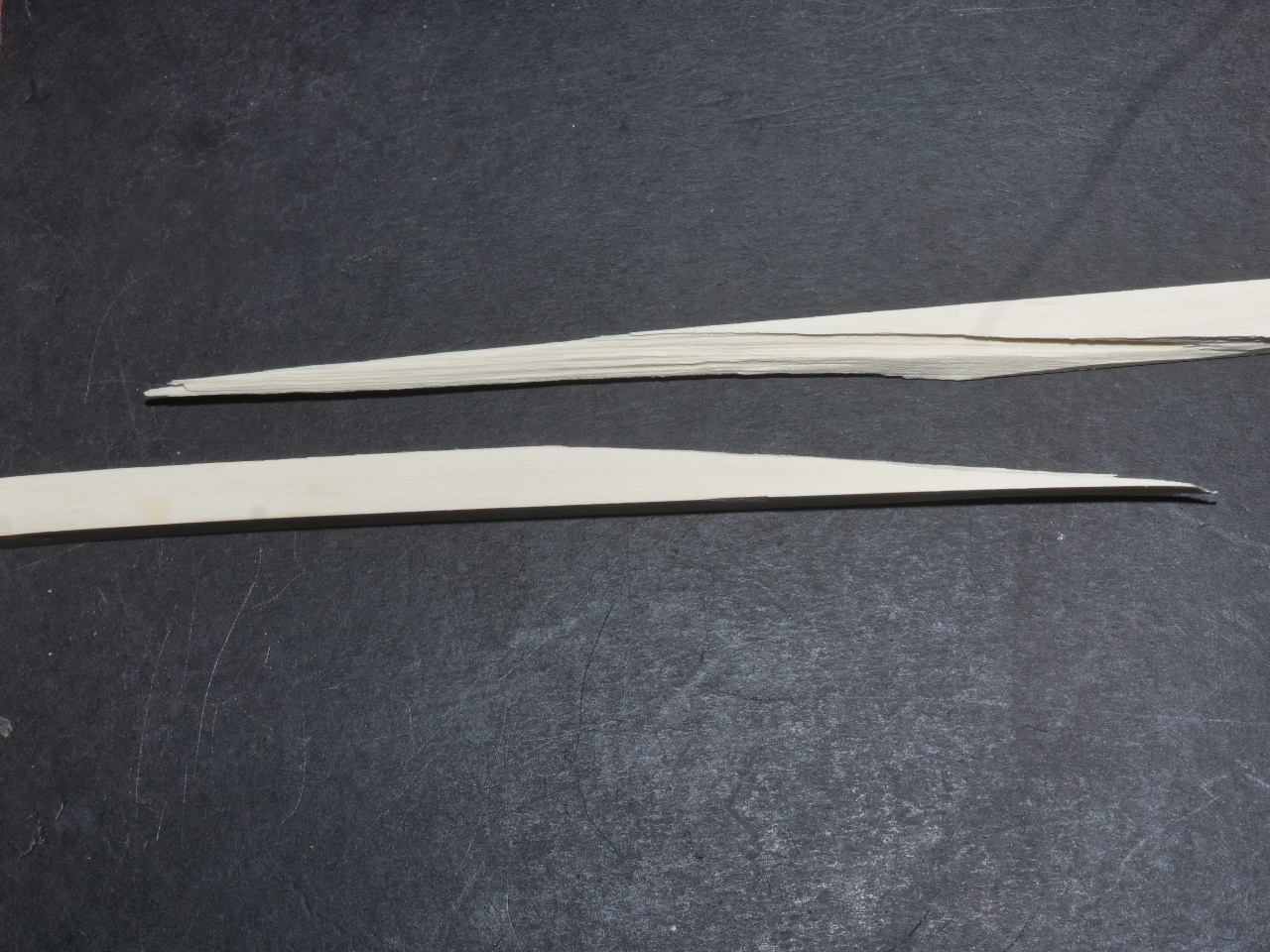 Aber: Das Ilex-Holz ist schwer und daher tendiere ich zu einem schmaleren Bogen, Typus "American flat" , ca. 3 cm breit. Die Griffsektion muss kürzer, aber insgesamt würde ich die Länge für einen Auszug von 28" so belassen (177 cm)