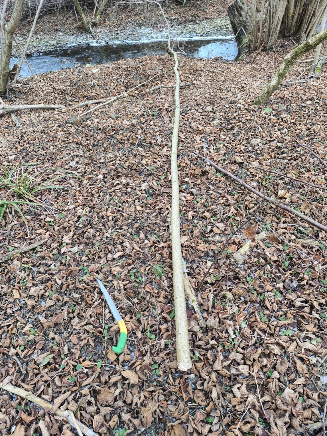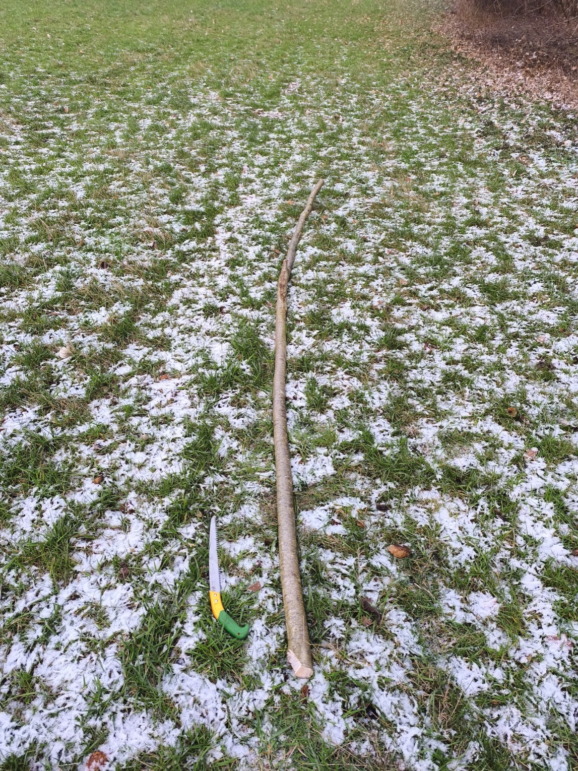 noch ca 250cm lang, der große Ast kommt in den steifen Griffbereich. Durchmesser unten ca 60mm