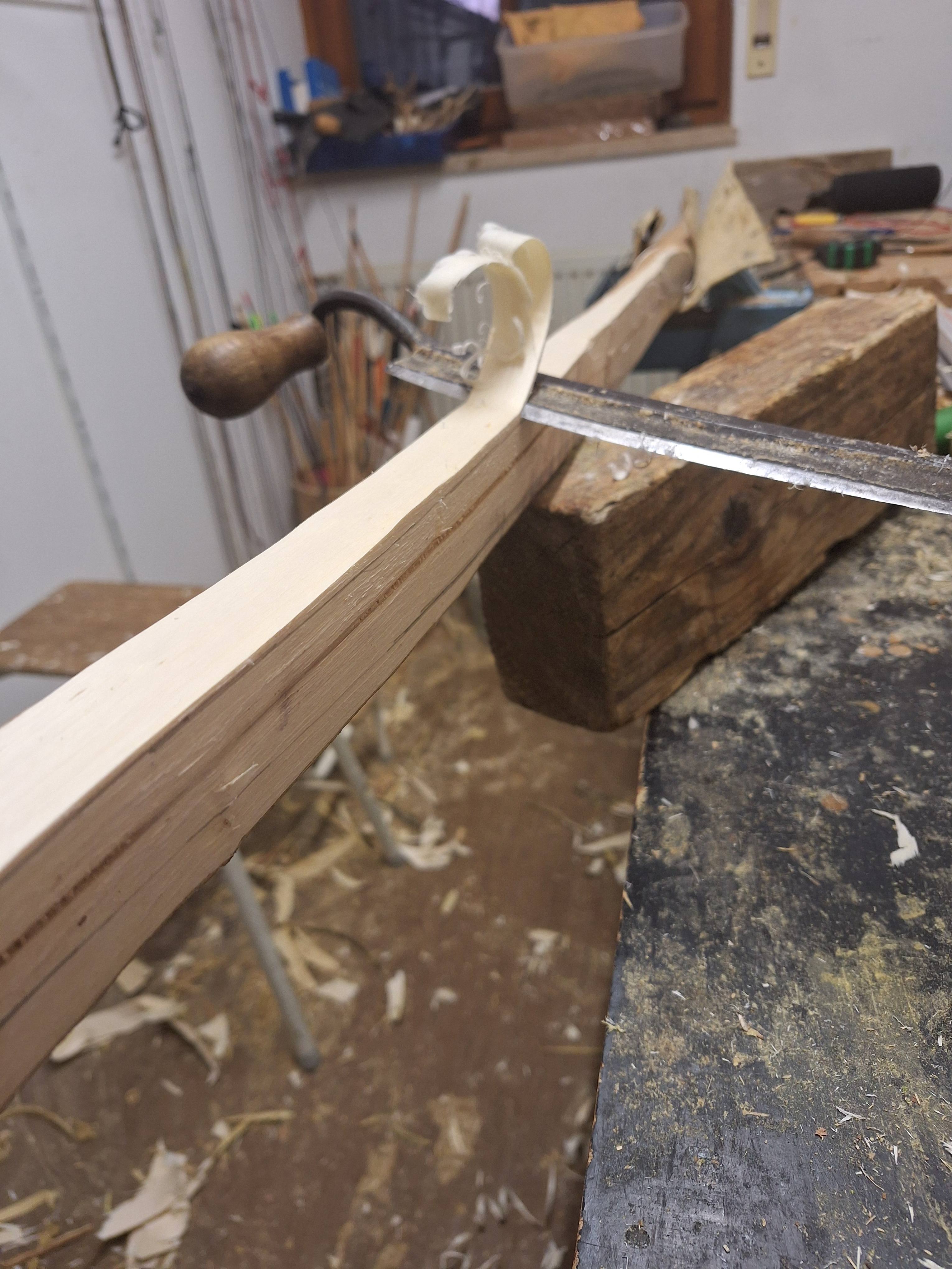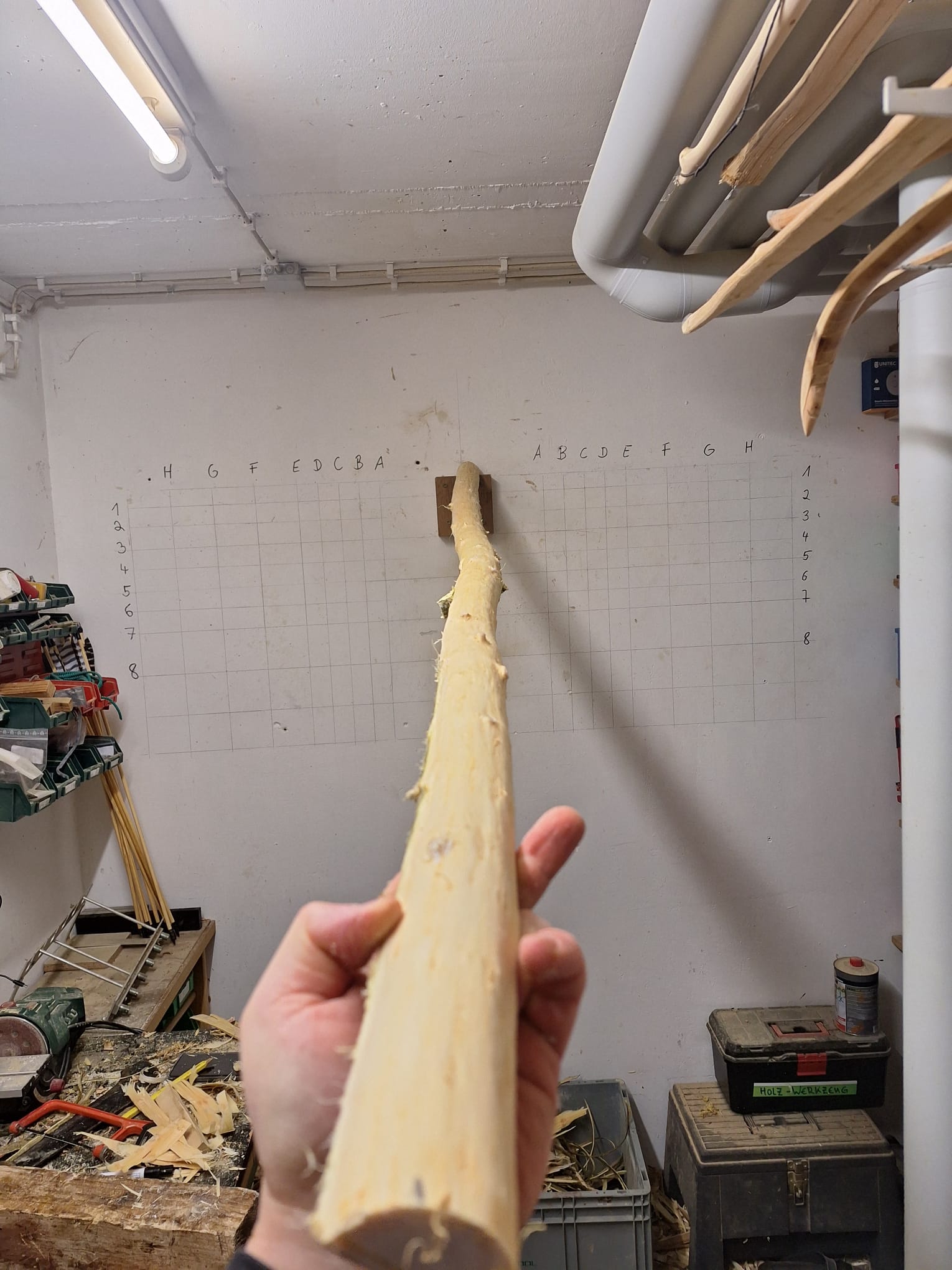 hab ihn jetzt eingekürzt auf 192cm und die grobe Form rausgearbeitet. Danach vor allem den Griffbereich und die Fadeouts wieder 2fach mit Schelllack versiegelt..
