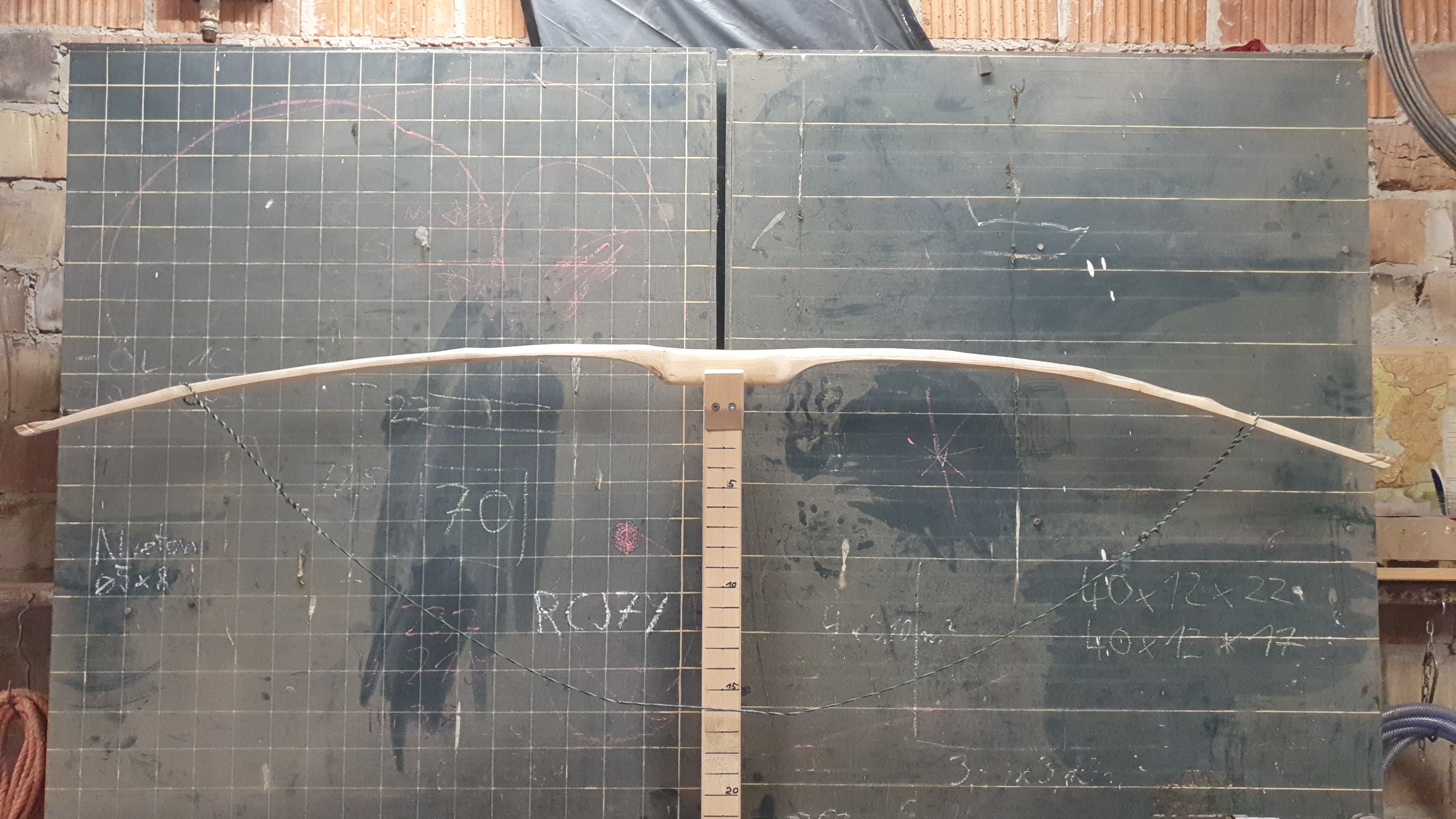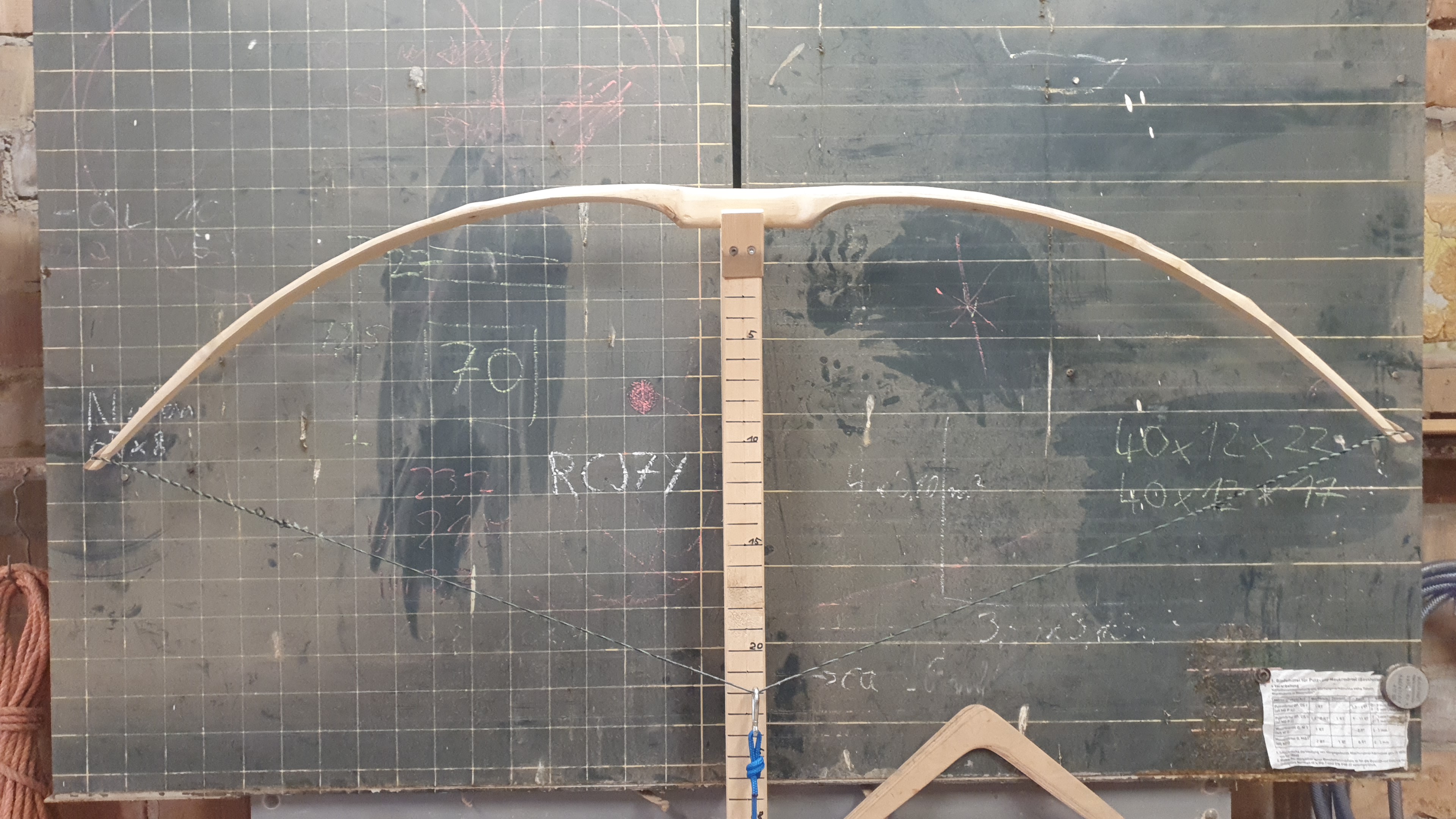 Die Trocknung: also, halbiert habe ich den Stave nicht. Zumindest nicht komplett. Ich habe mit Schnur und Messhilfen die pyramidale Form auf den Stave gelegt und dann die Wurfarme auf der Rückseite nach außen hin etwas absteigend alle paar cm eingesägt und dann die Scheibchen abgestemmt. Die Flanken habe ich dann mit der Bandsäge etwas außerhalb der Linie abgesägt. Die Rinde am Rücken blieb drauf. So lag er dann etwa 14 Monate gut belüftet. Im Griffbereich ist ein Trockenriss entstanden sonst nirgends. Naja und mit der Verarbeitung habe ich letztes Jahr im September begonnen und oft dann immer wieder kaum Zeit gehabt, so dass er immer wieder eine Weile herum lag. Ich kann es nicht genau sagen, aber ich glaube ehrlich gesagt nicht, dass er noch so feucht war. Mein Eindruck ist auch eher, dass sich der Set hauptsächlich auf den deflexen WA bezieht (in den Bildern am Tillerstock rechts).